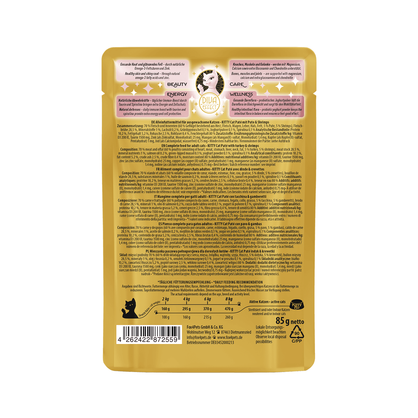 Das KITTY Cat Katzennassfutter Paté mit Pute & Shrimps ist ein Alleinfuttermittel, das speziell für die Bedürfnisse ausgewachsener Katzen konzipiert wurde. Die feine Pastete kombiniert zartes Geflügel mit dem Geschmack von Meeresfrüchten zu einer Mahlzeit für anspruchsvolle Samtpfoten.