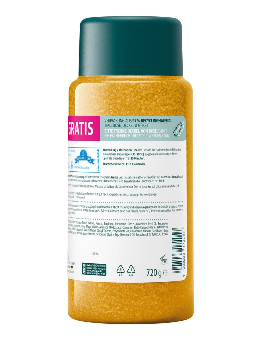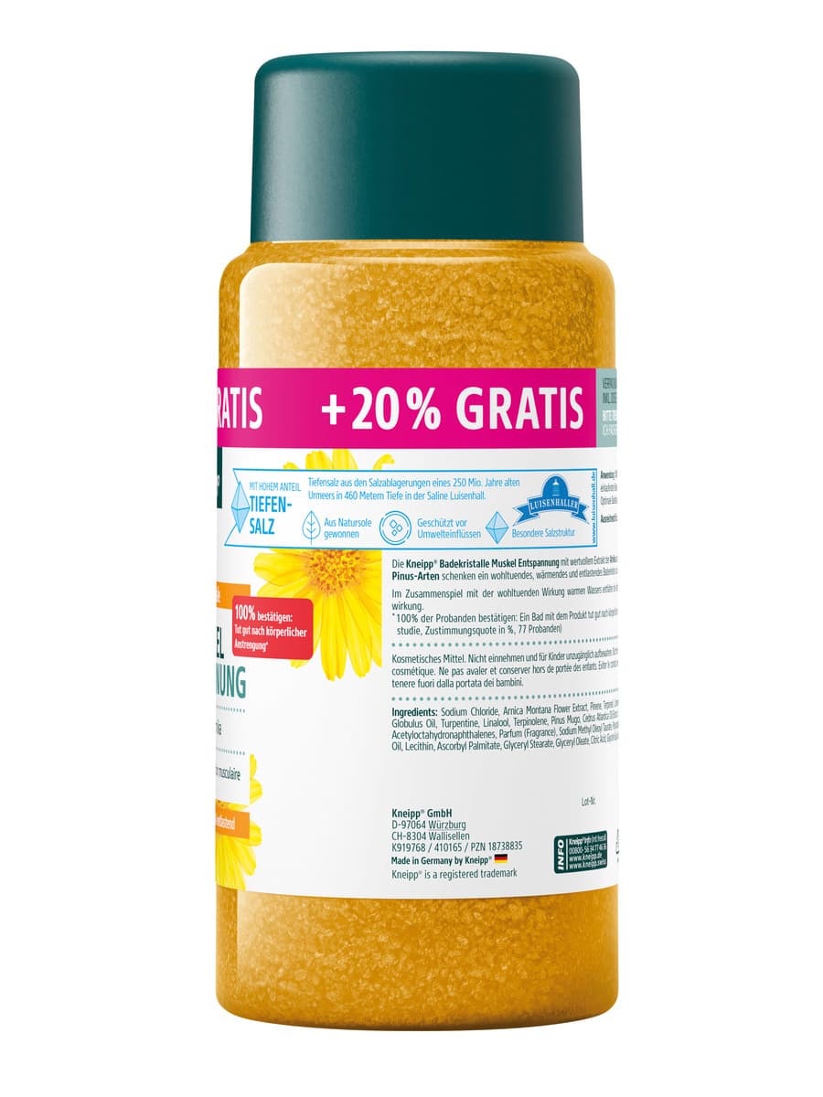 Die Kneipp® Badekristalle Muskel Entspannung mit wertvollem Extrakt der Arnika und natürlichen ätherischen Ölen aus Cabreuva, Rosmarin und Pinus-Arten schenken ein wohltuendes, wärmendes und entlastendes Badeerlebnis und bewahren die Feuchtigkeit der Haut. Im Zusammenspiel mit der wohltuenden Wirkung warmen Wassers entfalten die ätherischen Öle in ihrer Kombination ihre natürliche Duftwirkung. * 100% der Probanden bestätigen: Ein Bad mit dem Produkt tut gut nach körperlicher Anstrengung. (Anwendungsstudie, Zustimmungsquote in %, 77 Probanden) MIT HOHEM ANTEIL TIEFENSALZ Tiefensalz aus den Salzablagerungen eines 250 Mio. Jahre alten Urmeers in 460 Metern Tiefe in der Saline Luisenhall Aus Natursole gewonnen Geschützt vor Umwelteinflüssen Besondere Salzstruktur Kosmetisches Mittel.