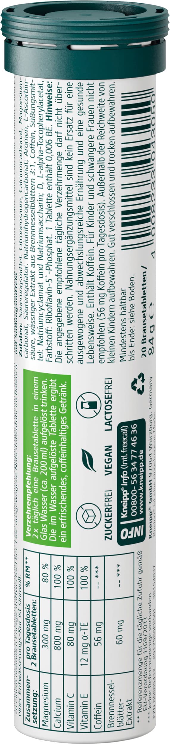 Zutaten | Säuerungsmittel: Citronensäure; Calciumcarbonat, Magnesiumcarbonat, Säureregulator: Natriumhydrogencarbonat; Aromen, L-Ascorbinsäure, wässriger Extrakt aus Brennnesselblättern 3:1, Coffein, Süßungsmittel: Natriumcyclamat und Natriumsaccharin; D, L-alpha-Tocopherylacetat, Farbstoff: Riboflavin-5`-Phosphat. 1 Tablette enthält 0,006 BE. |