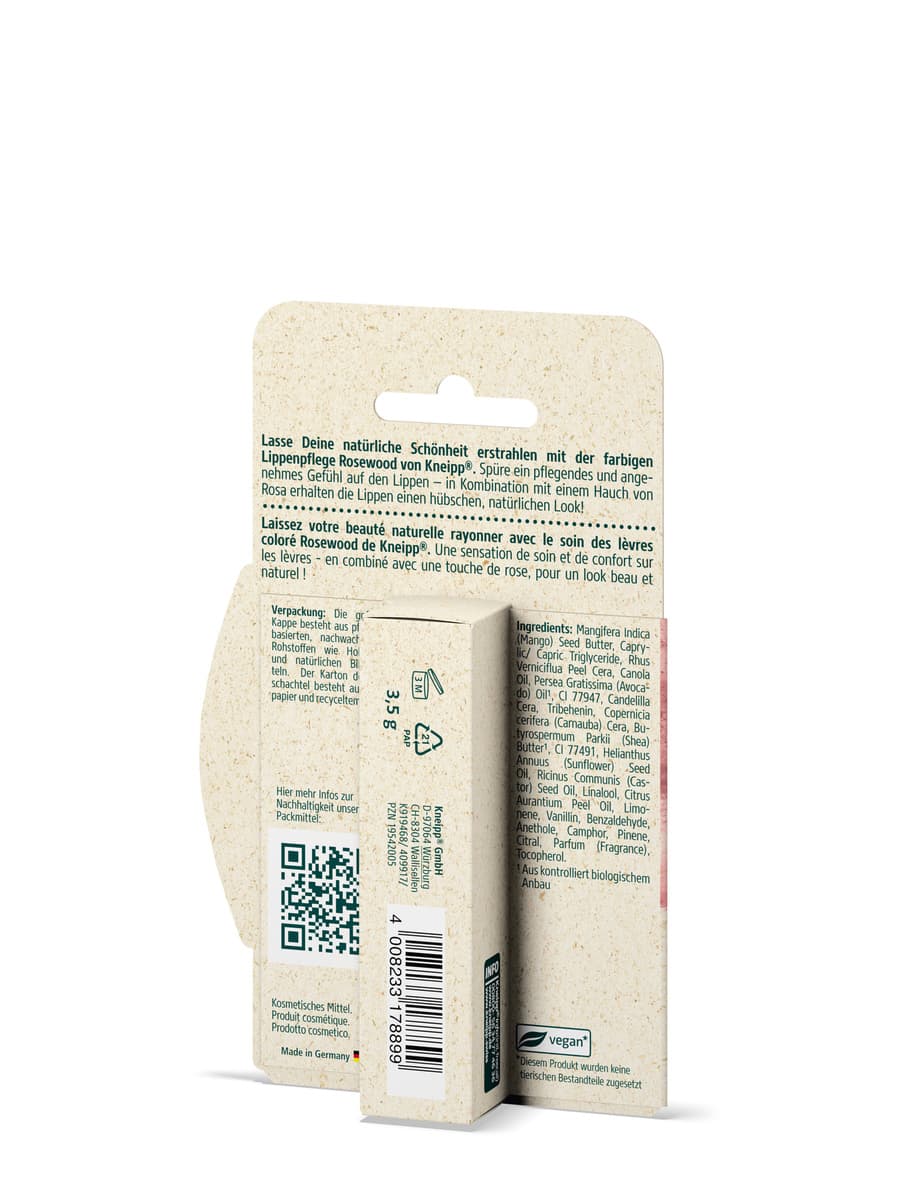 Lasse Deine natürliche Schönheit erstrahlen mit der farbigen Lippenpflege Rosewood von Kneipp®. Spüre ein pflegendes und angenehmes Gefühl auf den Lippen – in Kombination mit einem Hauch von Rosa erhalten die Lippen einen hübschen, natürlichen Look! Kosmetisches Mittel. Verpackung: Die gefärbte Kappe besteht aus pflanzenbasierten, nachwachsenden Rohstoffen wie Holzfasern und natürlichen Bindemitteln. Der Karton der Faltschachtel besteht aus Graspapier und recyceltem Papier.