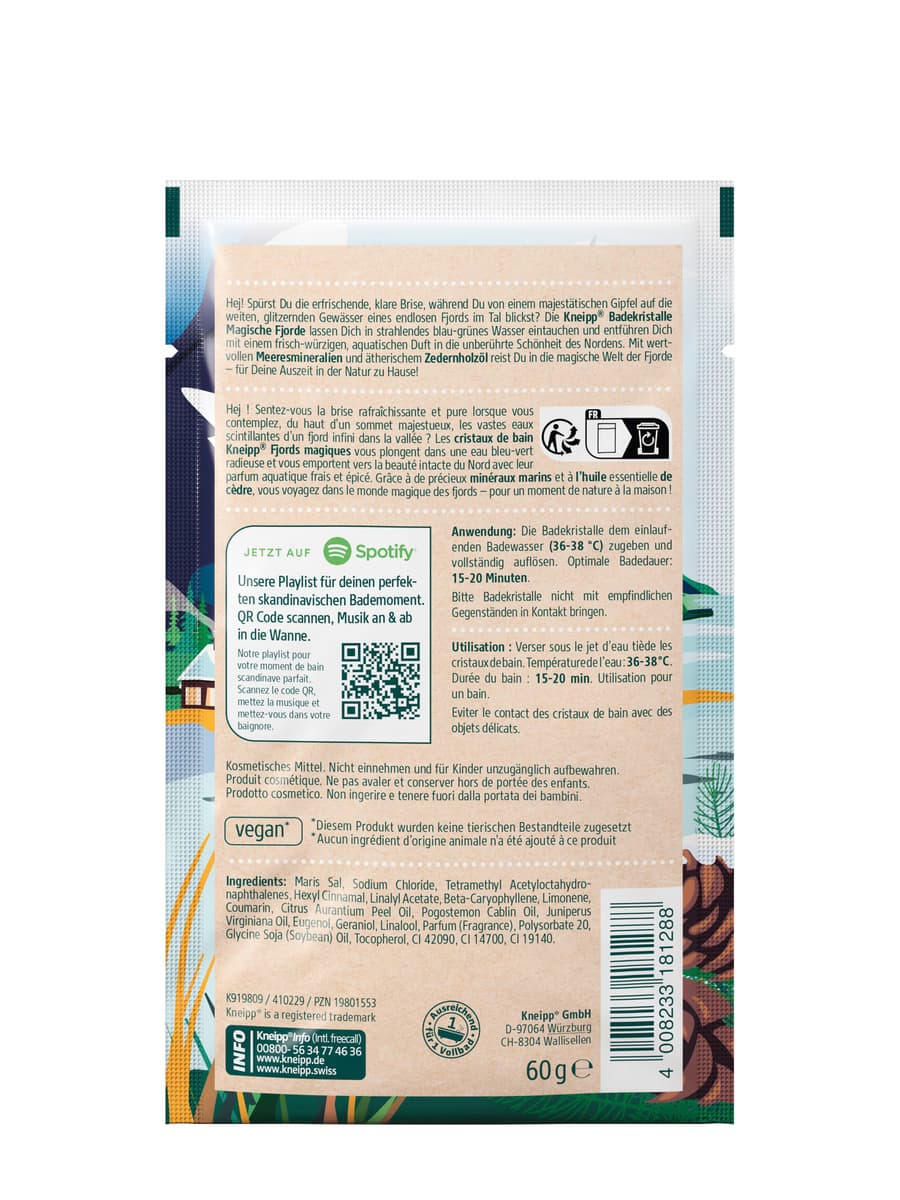 Hej! Spürst Du die erfrischende, klare Brise, während Du von einem majestätischen Gipfel auf die weiten, glitzernden Gewässer eines endlosen Fjords im Tal blickst? Die Kneipp® Badekristalle Magische Fjorde lassen Dich in strahlendes blau-grünes Wasser eintauchen und entführen Dich mit einem frisch-würzigen, aquatischen Duft in die unberührte Schönheit des Nordens. Mit wertvollen Meeresmineralien und ätherischem Zedernholzöl reist Du in die magische Welt der Fjorde – für Deine Auszeit in der Natur zu Hause! Kosmetisches Mittel.