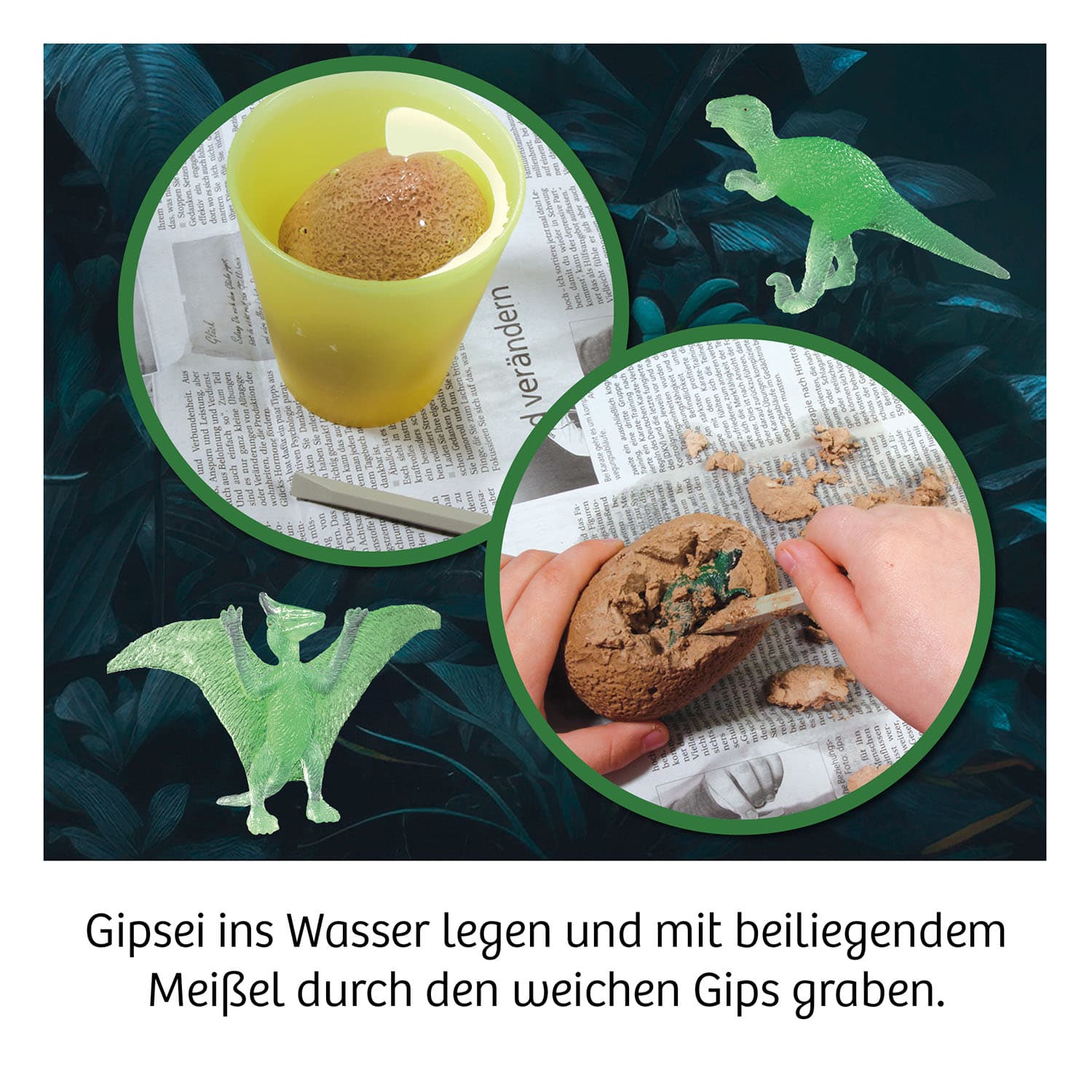 Gips-Ei kurz in Wasser einweichen und schon geht es mit dem beiliegenden Meißel-Werkzeug ans Ausgraben