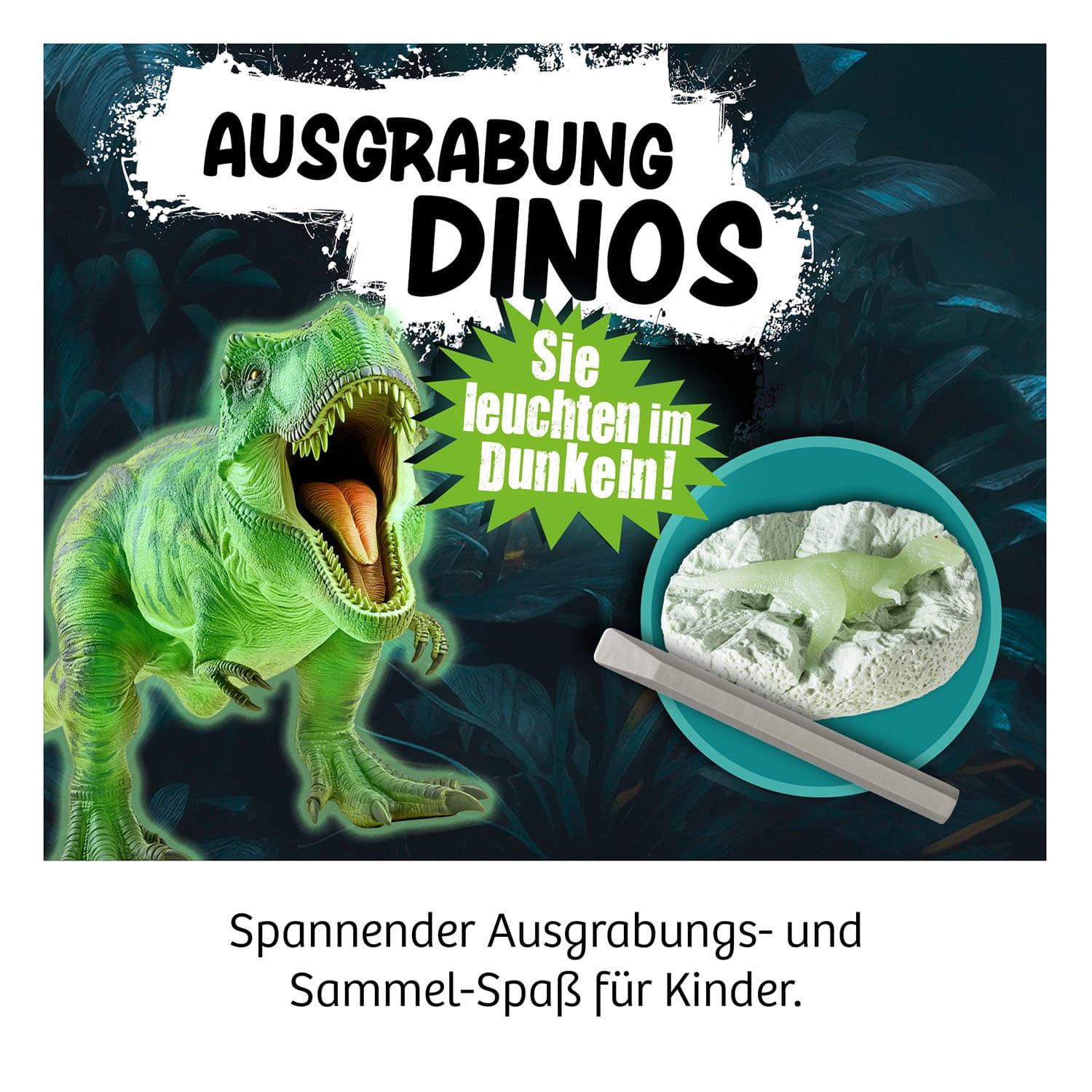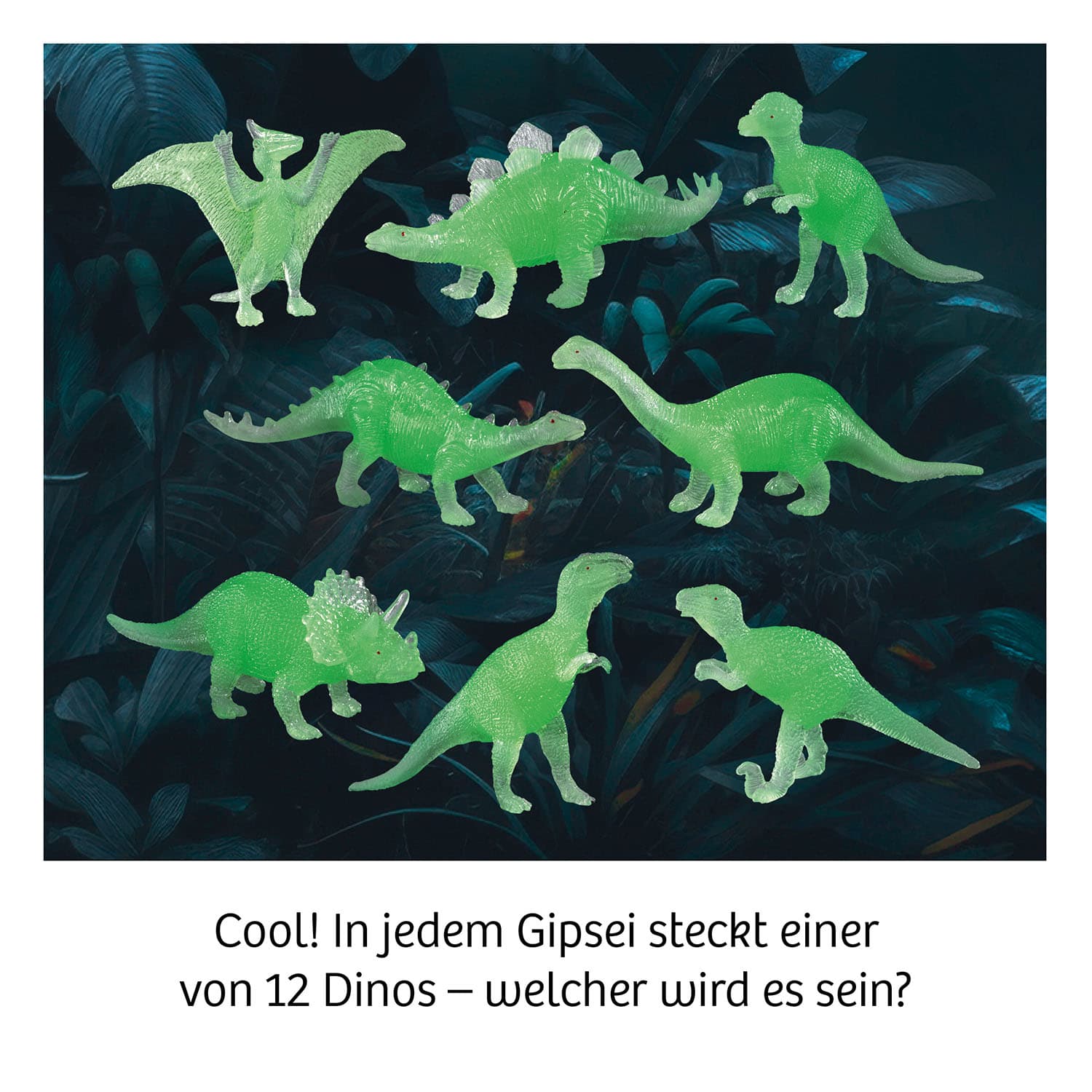 Diese Dinos verwandeln jedes Kinderzimmer in einen Urzeitwald - bei Tag und bei Nacht! Von Pachycephalosaurus über den gehörnten Triceratops bis hin zum mächtigen Tyrannosaurus, hier sind sie alle mit dabei! In diesem Ausgrabungs-Set finden Kinder ab fünf Jahren zwölf verschiedene Dinos. Einfach aus der Pappverpackung nehmen, den Gips-Ei kurz in Wasser legen und los geht das Ausgraben! Mit dem beiliegenden Meißel-Werkzeug geht das Freilegen aus dem besonderen Gipsmaterial ganz einfach. Durch erneutes Einlegen in Wasser kann der Gips noch zusätzlich aufgeweicht werden. In der Anleitung finden sich außerdem noch spannende Infos zu den Dinosauriern. | Dino-Ei aus weichem Gipsmaterial mit je einem von 12 nachtleuchtenden Dinos im Innern, Meißel-Werkzeug, Anleitungsblatt