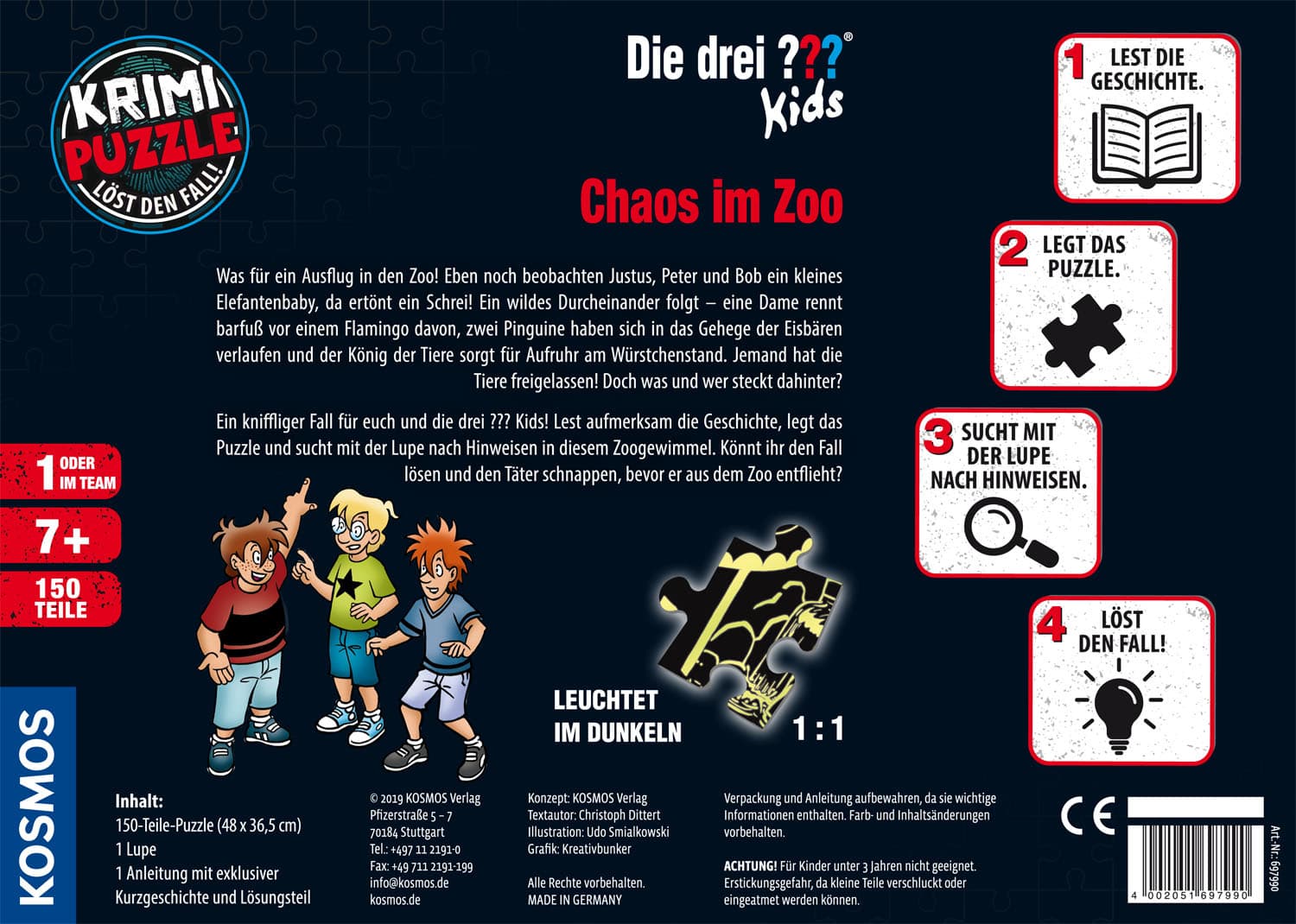 Kriminalfall lesen – Leuchtpuzzle legen – Rätsel lösen- Inklusive Lupe zum Aufspüren von versteckten Hinweisen- Puzzle leuchtet im Dunkeln- Zum Knobeln für alle Fans von Die drei ??? Kids- Mit exklusiver Die drei ??? Kids-Kriminalgeschichte- Tolles GeburtstagsgeschenkAnzahl der Spieler: 1 oder im TeamKriminalfall Lesen, Leuchtpuzzle legen, Fall lösenWildes Durcheinander im Zoo! Jemand hat die Tiere frei gelassen! Doch was und wer steckt dahinter? Ein Fall für clevere Detektive! Die Spieler lesen den Kriminalfall, legen das Puzzle und suchen nach Hinweisen, um den Fall zu lösen. Wie bei den drei ??? kommt dabei natürlich auch eine echte Lupe zum Einsatz. Cooler Rätselspaß für Nachwuchsdetektive!.Inhalt: 150 Teile Puzzle (Format: 48 x 36,5 cm), 1 Lupe, Anleitung mit exklusiver Kurzgeschichte und Lösungsteil