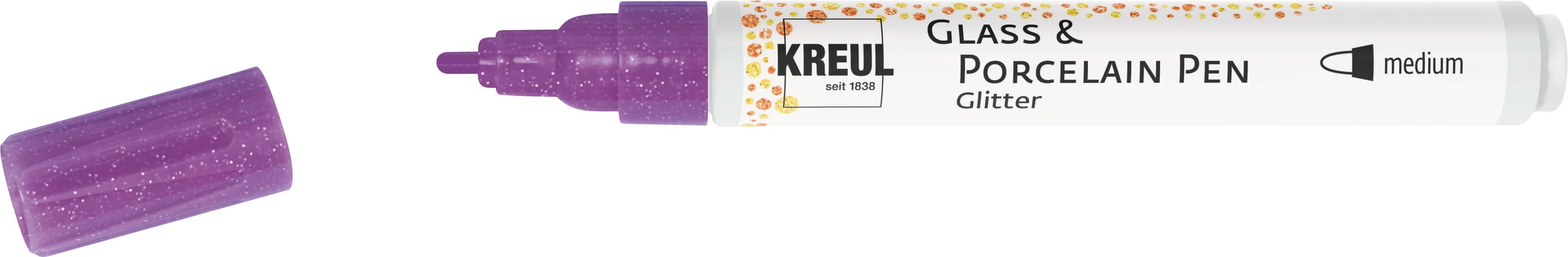 Glas- und Porzellanmalstift mit Glitzereffekt zum Bemalen und Verzieren. Mit den KREUL Glass & Porcelain Pens Glitter bringen Kreative bunte Punkte und herzliche Botschaften mit Glitzereffekt auf Tassen, Gläser, Teller, Vasen, Müslischalen & Co. Die Glas- und Porzellanmalfarben sind auf Wasserbasis hergestellt und im Stift ideal für dekorative Gestaltungen auf Glas, Porzellan, Keramik, Metall, Acryl und Spiegeln geeignet. Der bemalte Gegenstand aus hitzebeständigem Material wird zum Fixieren in den kalten Backofen gestellt. Wenn die Temperatur von 160 °C erreicht ist, die Bemalung 30 Minuten einbrennen. Fertig ist ein farbenfrohes Unikat!