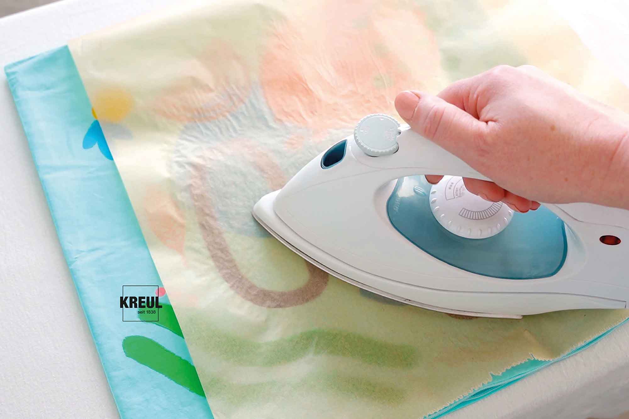 - So geht’s: Textilien vor dem Bemalen appretur- und weichspülerfrei waschen. Zum Schutz Backpapier zwischen die Stofflagen legen. Den bemalten Stoff nach einer Trockenzeit von 6 Stunden mit Backpapier abdecken und mit dem Bügeleisen bei Baumwolleinstellung 5 Minuten fixieren. Alternativ im Backofen den Stoff 8 Minuten bei 150°C fixieren. Fixierte Textilien sind linksseitig bis 40°C im Feinwaschgang waschbar.