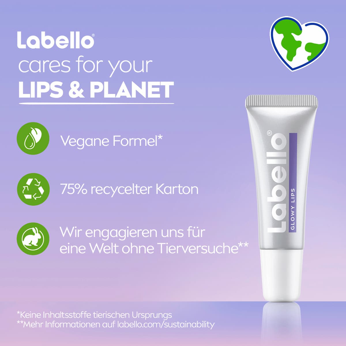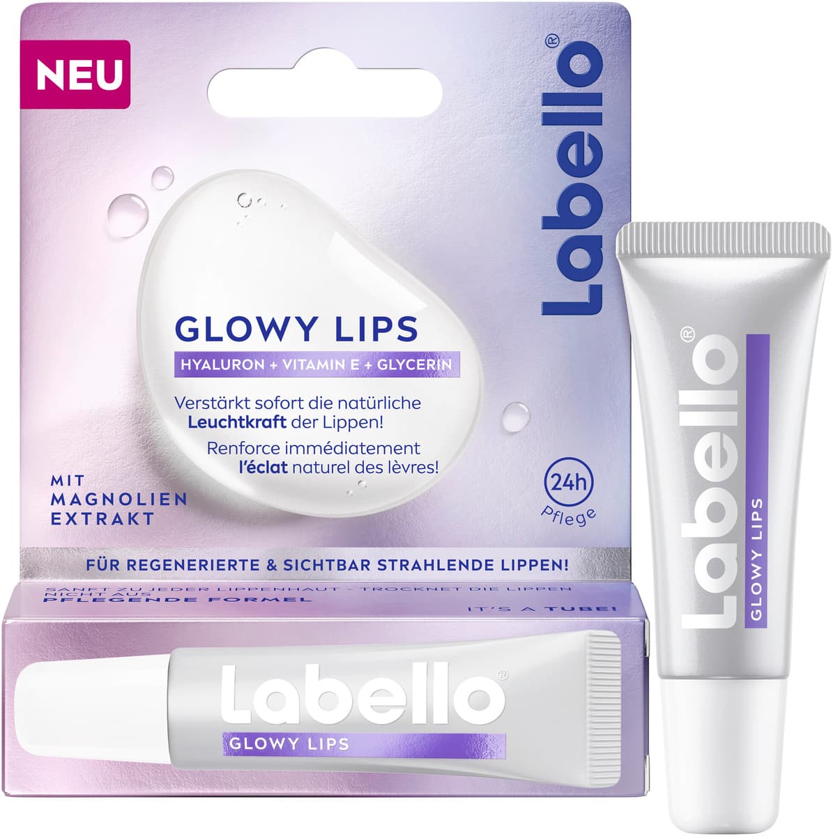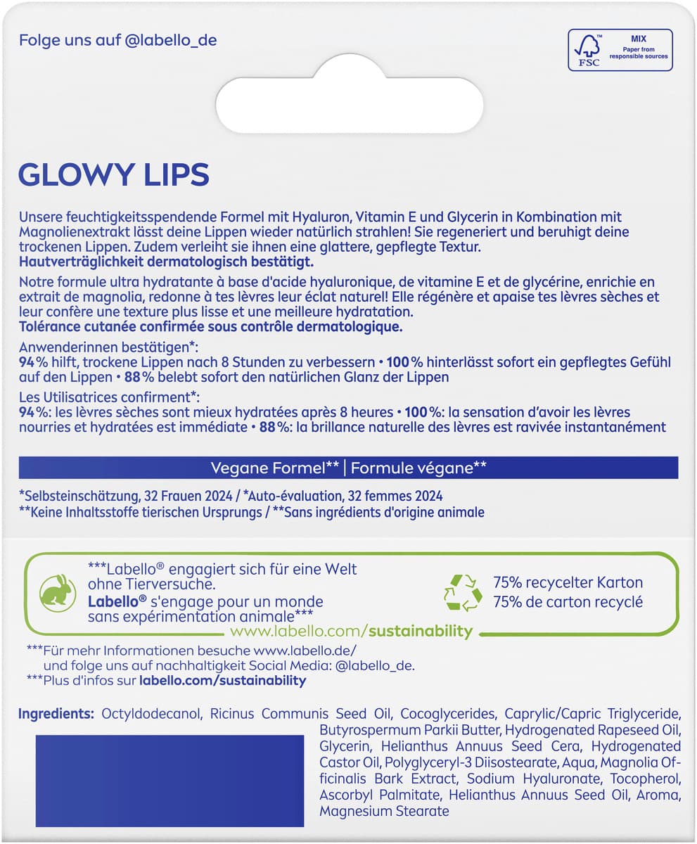 Labello® GLOWY LIPS verstärkt sofort den natürlichen Glow deiner Lippen. Angereichert mit unserer ultra-feuchtigkeitsspendenden Formel aus Hyaluronsäure, Vitamin E und Glycerin in Kombination mit Magnolien-Extrakt spendet diese Lippenpflege 24 h Feuchtigkeit. Sie regeneriert, beruhigt deine trockenen Lippen und verleiht ihnen ein glatteres Gefühl. Labello® ist sanft zu jeder Lippenhaut. Hautverträglichkeit dermatologisch bestätigt.