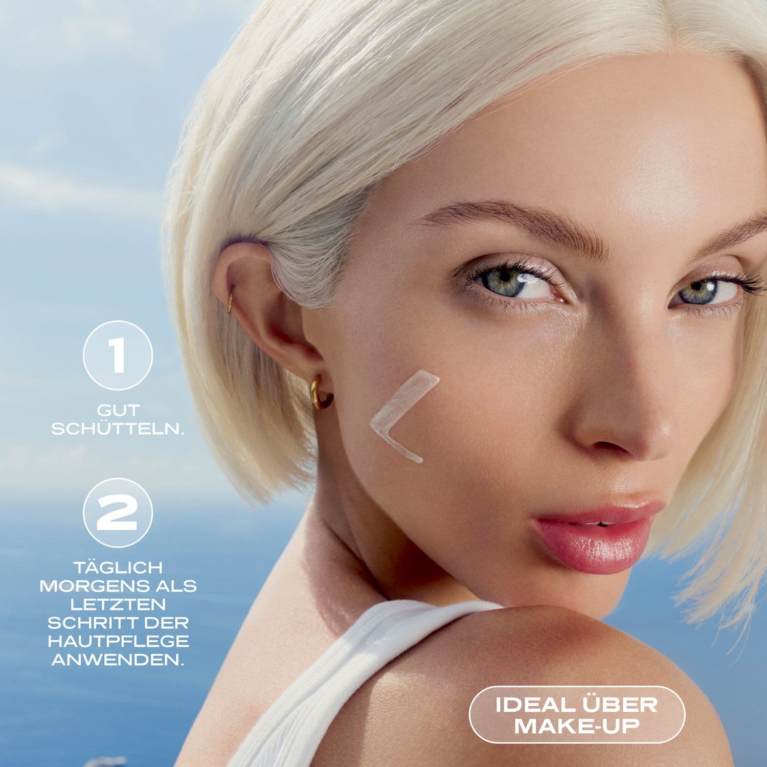 Diese mit einem leistungsstarken antioxidativen Komplex [Vitamin C + Chromanol + Schmetterlingsstrauch-Extrakt] angereicherte Formulierung verstärkt die Strahlkraft der Haut sichtbar, während sie sie vor täglichen schädigenden Umwelteinflüssen schützt, um einen leuchtenden, gesund aussehenden Glow zu offenbaren. Mit jedem Tag offenbart die Haut sichtbare Perfektion. Leuchtende Schimmertextur für einen leuchtenden Glow-Effekt. Nicht fettende, schnell einziehende Textur. Ideal als Make-up-Grundlage. An fahler, müder, durch urbane Umwelteinflüsse überstrapazierter Haut getestet. Klinisch bewiesene Ergebnisse: +41 % mehr Strahlkraft der Haut.*** +33 % Verbesserung der Ebenmäßigkeit der Haut.*** 94 % beobachteten einen gesund aussehenden Glow nach nur 1 Anwendung.**** 97 % bestätigen, dass sich die Haut kräftiger und widerstandsfähiger gegenüber schädigenden Umwelteinflüssen (wie Luftverschmutzung) anfühlt.**** 100 % bestätigen, dass das Produkt eine außerordentlich schwerelose, schnell einziehende Textur besitzt, die ansatzfrei mit der Haut verschmilzt und ein unsichtbares, atmungsaktives Finish hinterlässt.**** *US10278914B2 ***Klinischer Test an 29 Frauen nach Anwendung von Sun Perfect AIR Daily Invisible Fluid SPF50 Glow Booster zweimal täglich über 4 Wochen. ****Verbrauchertest an 29 Frauen nach Anwendung von Sun Perfect AIR Daily Invisible Fluid SPF50 Glow Booster zweimal täglich über 4 Wochen.