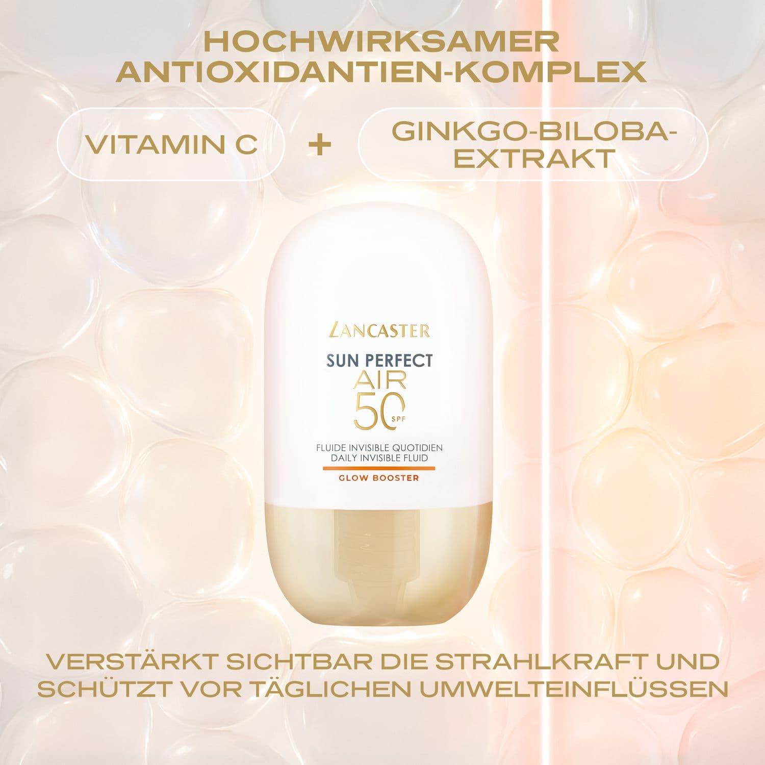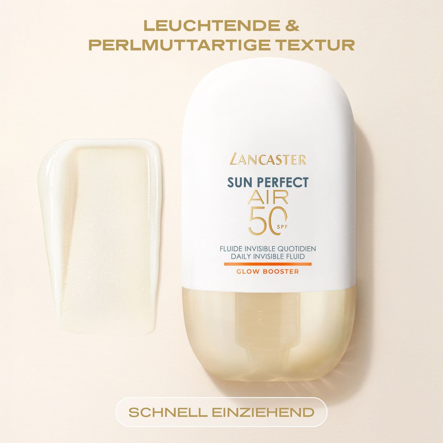 UNSICHTBARER SONNENSCHUTZ. SICHTBARE HAUTREPARATUR. Mit einer bahnbrechenden Formulierung, die unsichtbaren Sonnenschutz und zielgerichtete Korrektur bei Hautproblemen mithilfe dermatologischer Wirkstoffe kombiniert, definiert Lancaster Sun Perfect AIR Daily Invisible Fluid SPF 50 Glow Booster definiert UV-Schutz für jeden Tag neu. Dieses Lancaster Sonnenschutz-Fluid, das speziell für fahle, müde aussehende, schädigenden urbanen Umwelteinflüssen ausgesetzte Haut formuliert wurde, bietet leistungsstarken Schutz für jeden Tag mit strahlkraftverstärkenden Eigenschaften. Die ultraleichte Textur bietet ein atmungsaktives, schwereloses, unsichtbares Finish - ganz ohne Beschweren oder weiße Rückstände. Unterstützt durch eine exklusive Zweifach-Technologie: