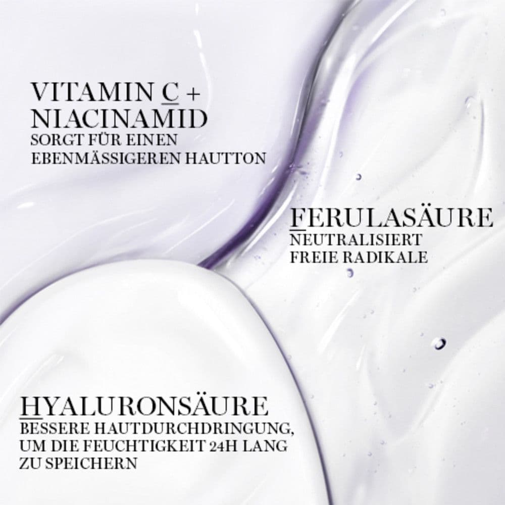 Die drei Texturen des Serums werden erst bei der Anwendung zu einem Konzentrat vermischt. Die Formel enthält eine Kombination aus Hyaluronsäure, Vitamin C, Niacinamid und Ferulasäure. Für eine optimale Anwendung wird das Gesicht zunächst gereinigt. Anschließend werden ein bis zwei Pumpstöße in die Hand gegeben und die drei Formeln vermischt. Das Serum wird in drei Schritten aufgetragen: Zuerst mit Druckbewegungen auf der Haut verteilen, dann auf den Wangen sanft von innen nach außen bis zur Schläfe einmassieren und zum Schluss an der Stirnpartie von der Augenbraue nach oben bis zum Haaransatz streichen. Jeder Schritt kann dreimal wiederholt werden.