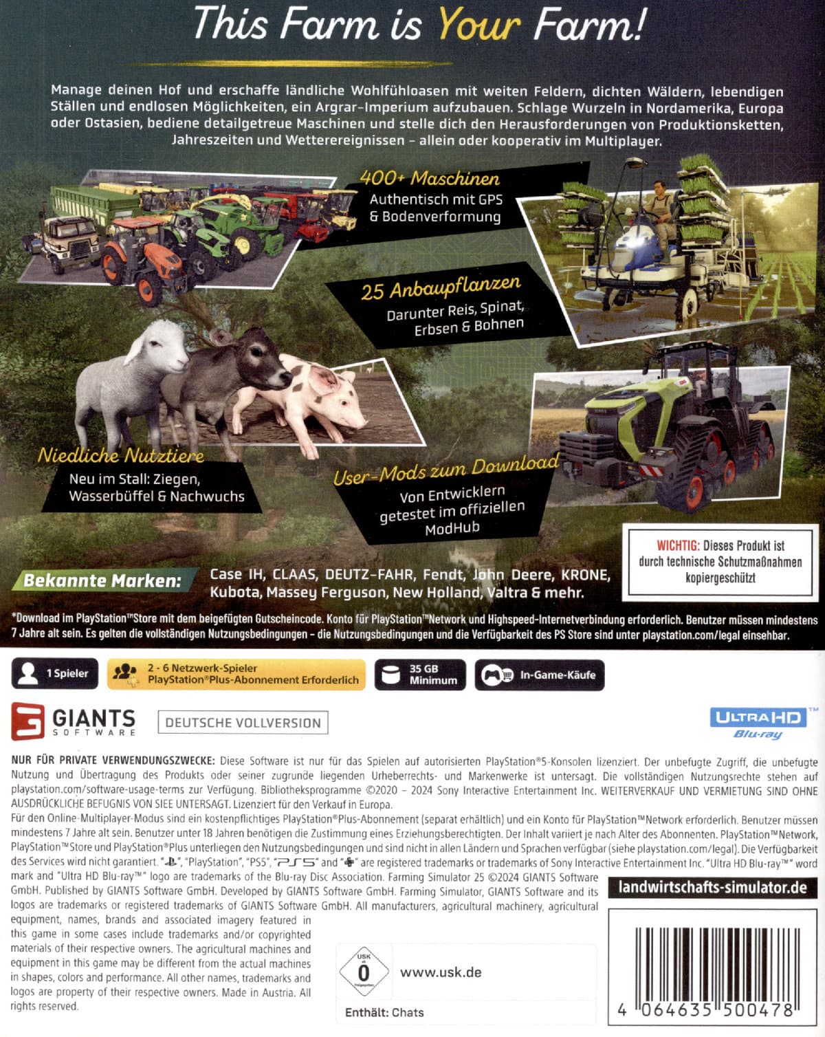 Mehr als 400 authentische Maschinen und Gerätschaften von mehr als 150 internationalen Topmarken wie Case IH, CLAAS, Fendt, John Deere, Kubota, Massey Ferguson, Krone, Kubota, New Holland, Valtra und mehr lassen euch in die spannende Welt von Landwirtschaft, Forstwirtschaft und Viehzucht eintauchen. Egal ob im Alleingang oder im kooperativen Mehrspielermodus: Ihr entscheidet, wie ihr euer Agrarimperium gestaltet.