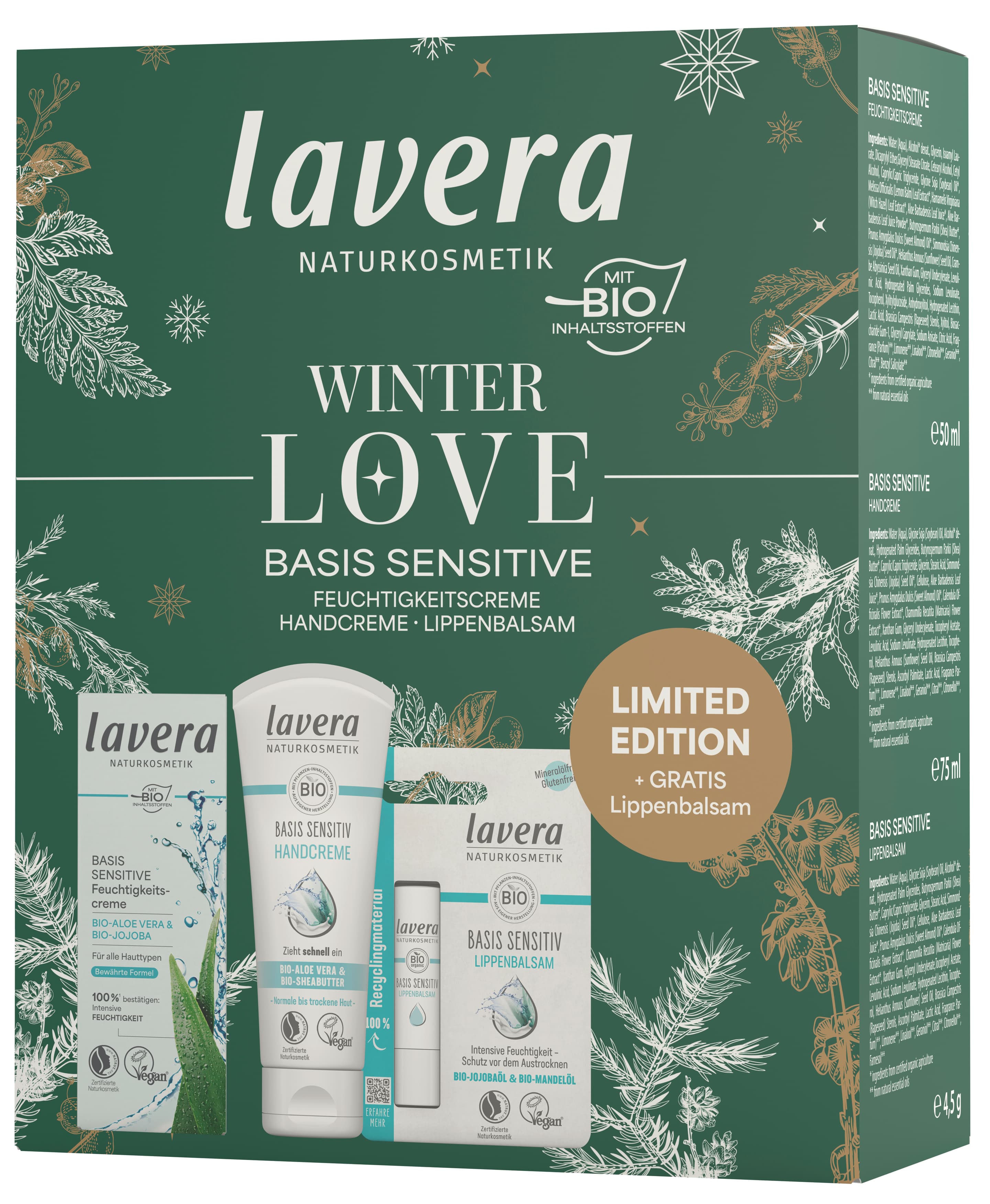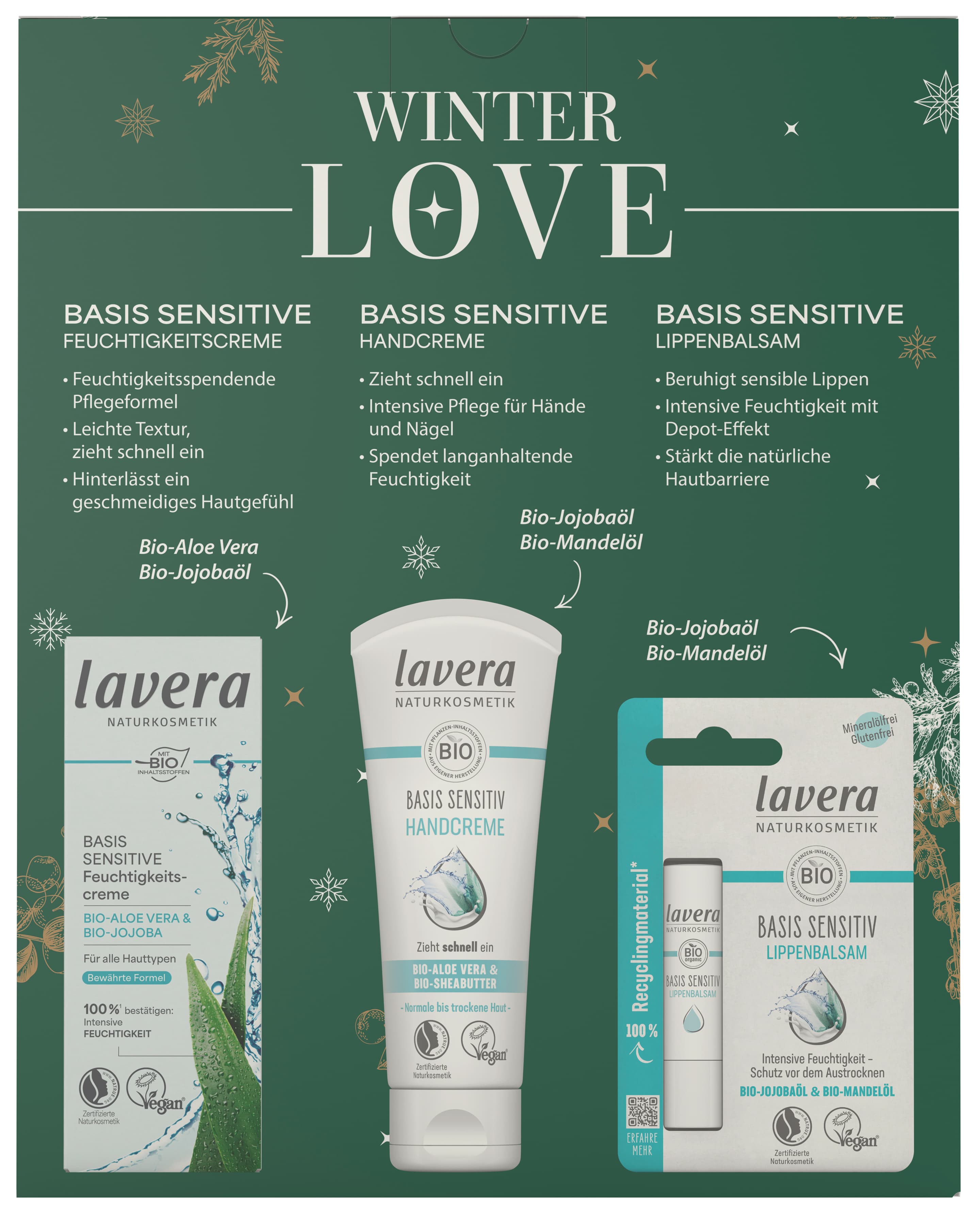 Das lavera basis sensitiv Winter-Pflege-Trio: Feuchtigkeitscreme, Lippenpflege und Handcreme – die perfekte natürliche Pflege für die kalte Jahreszeit.
