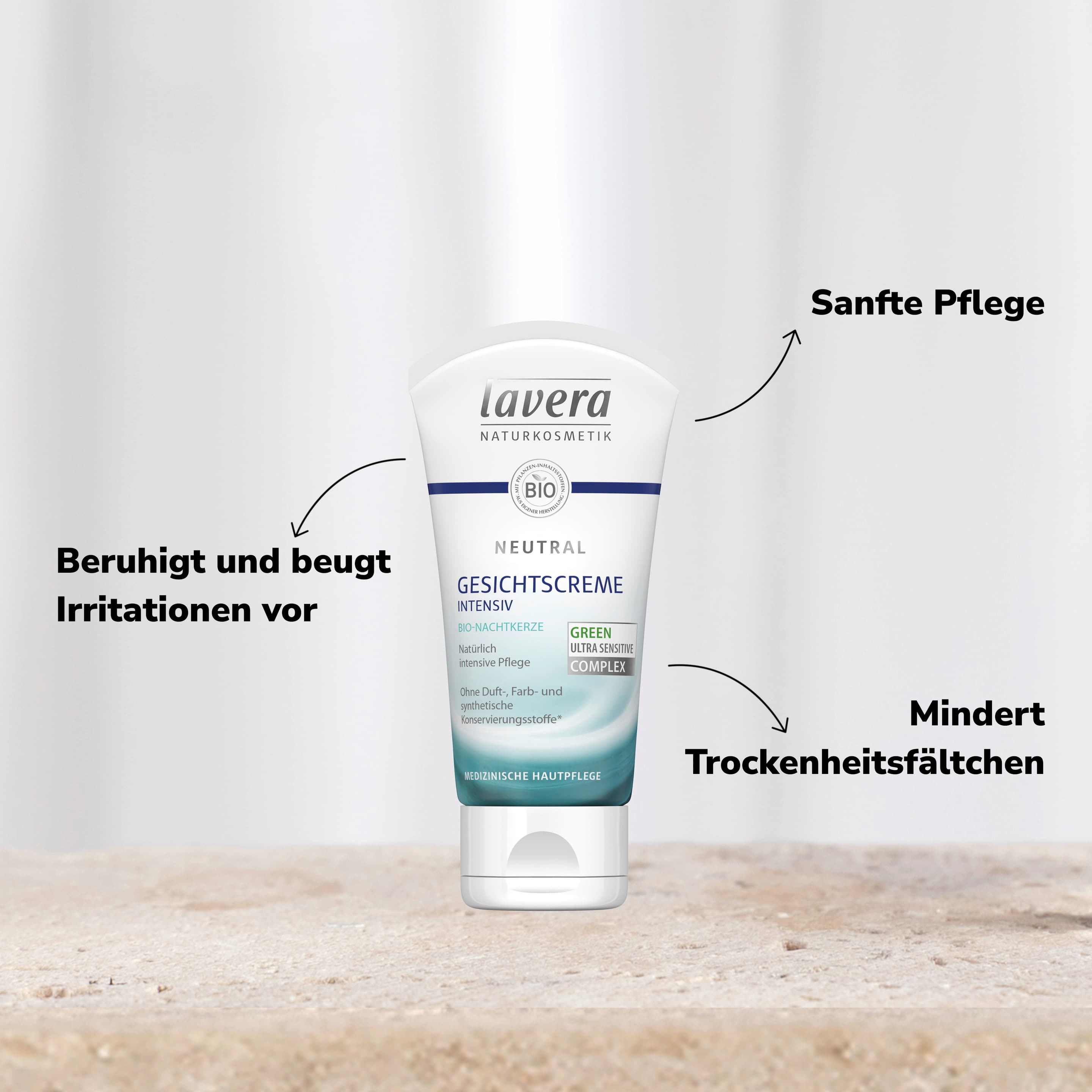 Tägliche, hochwirksame Pflege aus der Natur Die lavera Neutral Gesichtscreme ist besonders gut verträglich. Sie beruhigt gereizte Haut und beugt Irritationen vor.