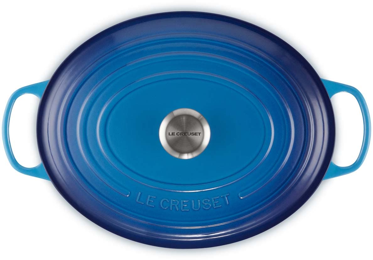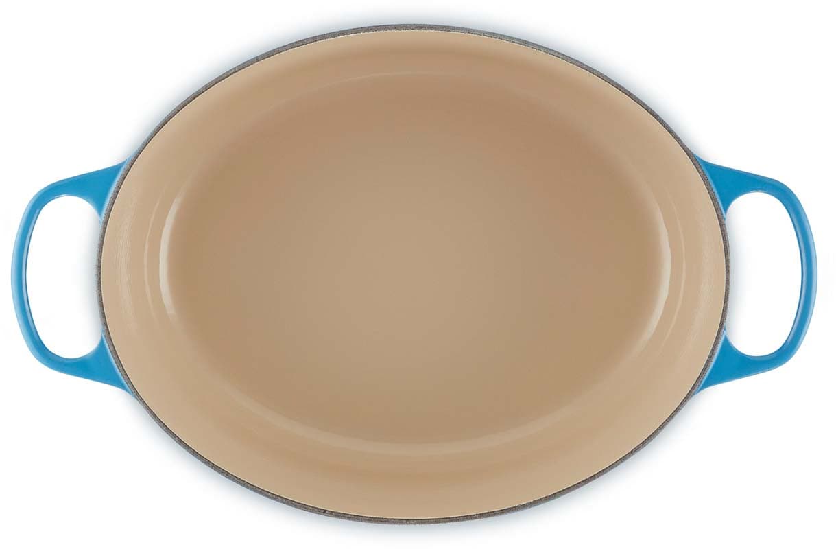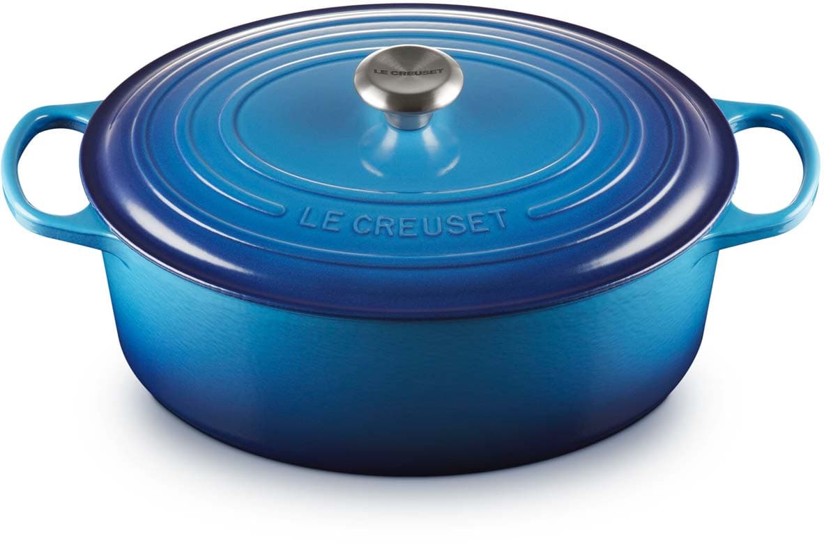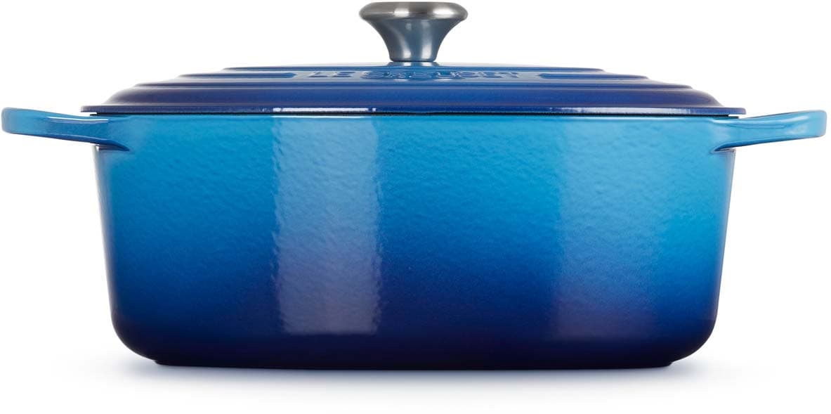 Der ovale gusseiserne Bräter Signature von Le Creuset mit 33 cm Durchmesser eignet sich ideal für größere Fleischstücke und ganze Braten. Versuchen Sie zum Beispiel, ein ganzes Hähnchen mit aufgesetztem Deckel zu garen – das Fleisch wird wunderbar saftig, fällt vom Knochen und der Ofen bleibt sauber. Der ovale Bräter ist genauso vielseitig wie sein rundes Pendant. Er bietet ausreichend Platz, um eine ganze Lammkeule zuzubereiten, und ist gleichzeitig schmal genug, um im Ofen zusätzlichen Raum für Beilagen zu lassen.