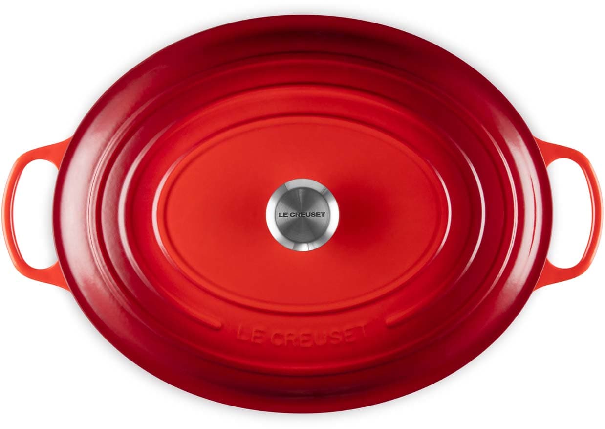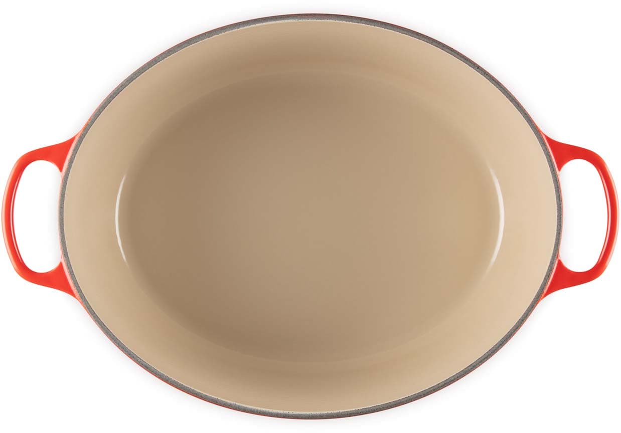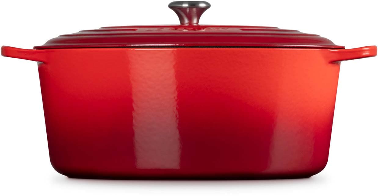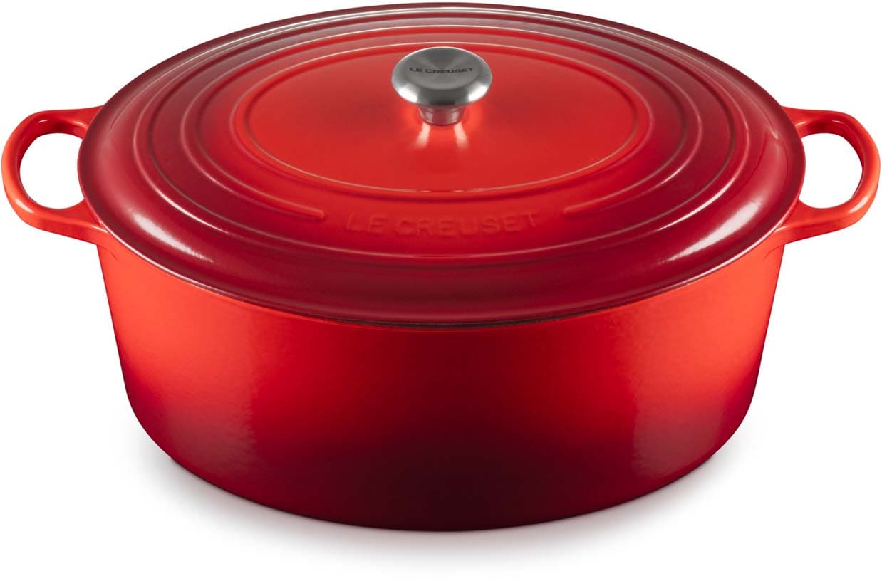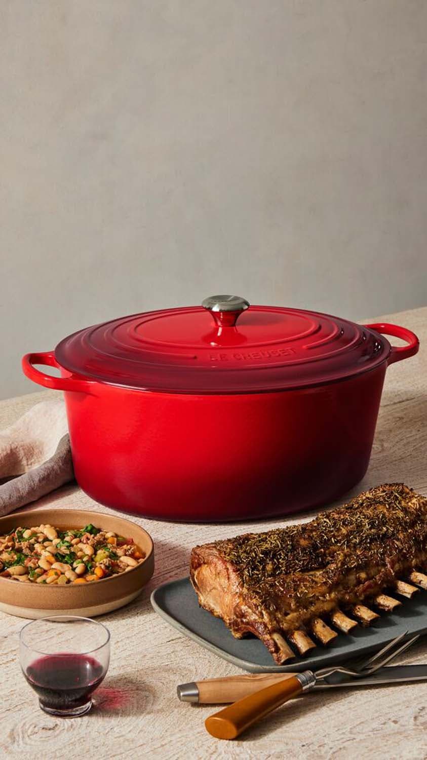Der ovale gusseiserne Bräter Signature von Le Creuset mit 40 cm Durchmesser eignet sich ideal für größere Fleischstücke und ganze Braten. Versuchen Sie zum Beispiel, ein ganzes Hähnchen mit aufgesetztem Deckel zu garen – das Fleisch wird wunderbar saftig, fällt vom Knochen und der Ofen bleibt sauber. Der ovale Bräter ist genauso vielseitig wie sein rundes Pendant. Er bietet ausreichend Platz, um eine ganze Lammkeule zuzubereiten, und ist gleichzeitig schmal genug, um im Ofen zusätzlichen Raum für Beilagen zu lassen.