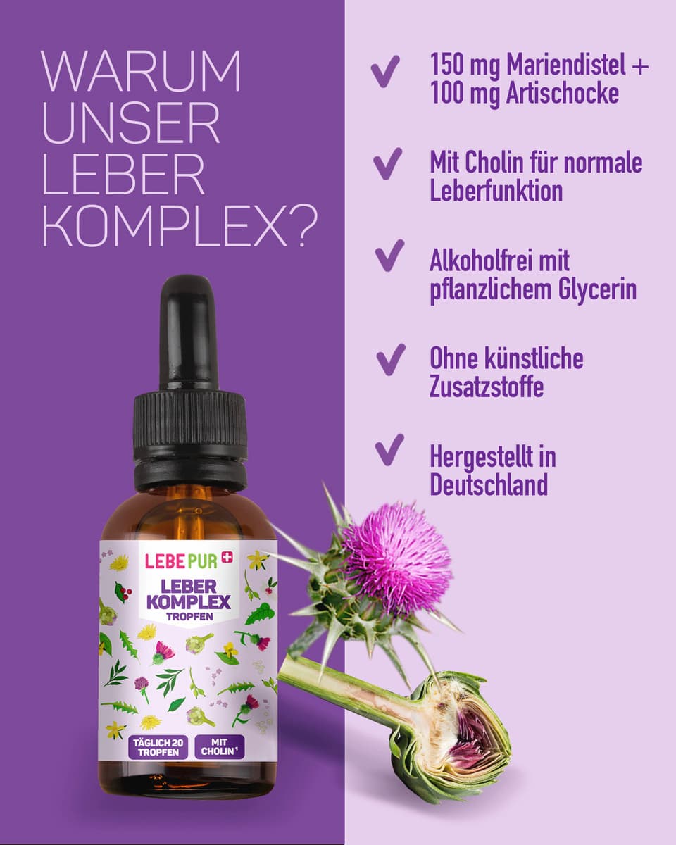 Leber Komplex Tropfen kombinieren traditionelle Pflanzenextrakte mit dem Nährstoff Cholin in einer praktischen flüssigen Darreichungsform. Die veganen Bittertropfen enthalten eine sorgfältig abgestimmte Mischung aus Mariendistel-Extrakt, Artischocken-Extrakt und Löwenzahnwurzel-Extrakt. Mit 87,5 mg Cholin pro Tagesdosis unterstützen die Lebertropfen eine normale Leberfunktion und einen normalen Fettstoffwechsel. Die Zusammensetzung basiert auf pflanzlichem Glycerin und Wasser als Trägerstoffe, wodurch die Mariendistel Tropfen ohne Alkohol auskommen. Die flüssige Form ermöglicht eine einfache Dosierung und flexible Einnahme vor den Mahlzeiten. Jede 30-ml-Flasche reicht bei empfohlener Anwendung für bis zu 30 Tage.