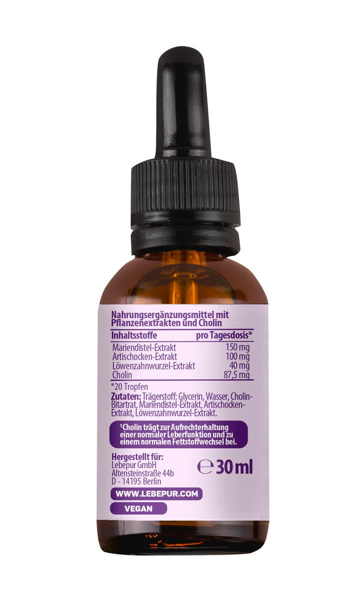 | Zutaten | Pflanzliches Glycerin, Wasser, Cholin-Bitartrat, Mariendistel-Extrakt, Artischocken-Extrakt, Löwenzahnwurzel-Extrakt. Mariendistel-Extrakt 150 mg Artischocken-Extrakt 100 mg Löwenzahnwurzel-Extrakt 40 mg Cholin 87,5 mg |