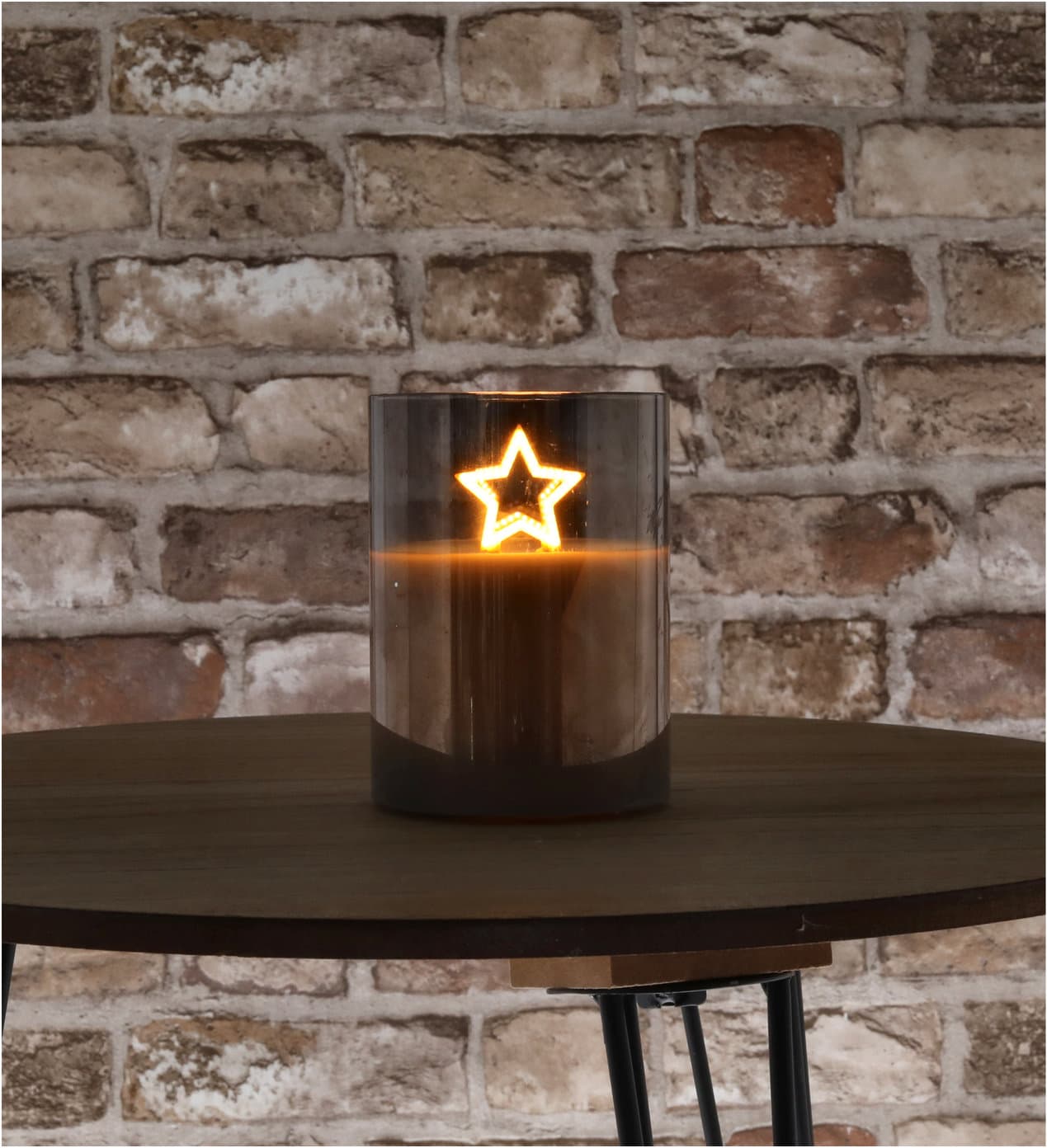 LED-Echtwachskerze im Glas mit Sternmotiv als dekoratives Element.