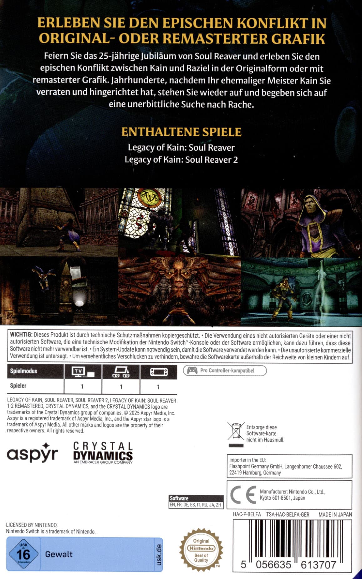 Tauche ein in eine zeitlose Geschichte von Vampiren, Verrat und Rache, während du das gespenstisch schöne Land Nosgoth in höherer Qualität als je zuvor durchquerst. Erlebe diese epischen Abenteuer auf deine Art und Weise, mit der Möglichkeit, während des Spiels zwischen der Originalgrafik und der überarbeiteten Grafik umzuschalten, sowie zwischen einem neuen modernen Steuerungsschema und der klassischen Steuerung zu wechseln.
