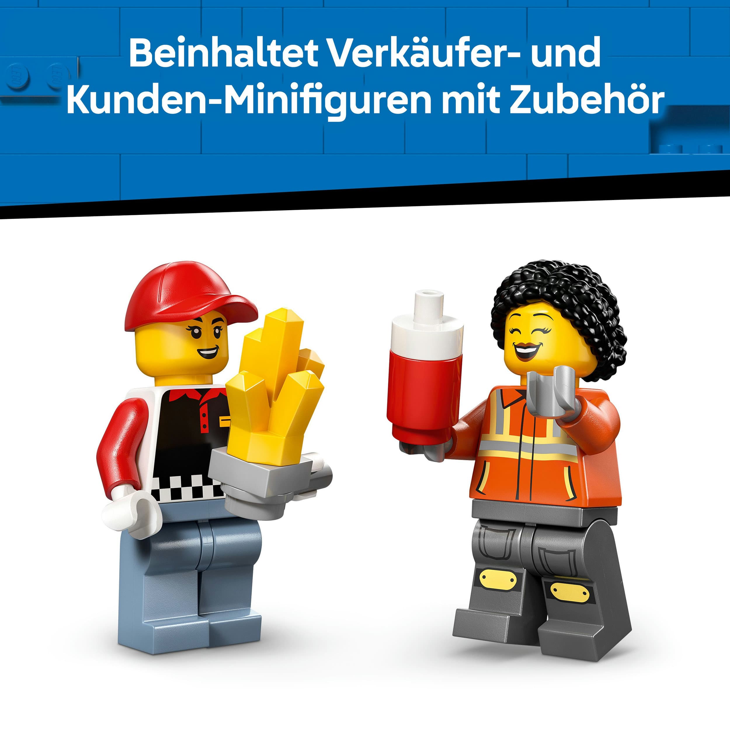 • LEGO® MINIFIGUR-ZUBERHÖR: Das Spielset für Kinder beinhaltet neben dem Imbisswagen auch eine Ketchupflasche und eine Pommesschachtel