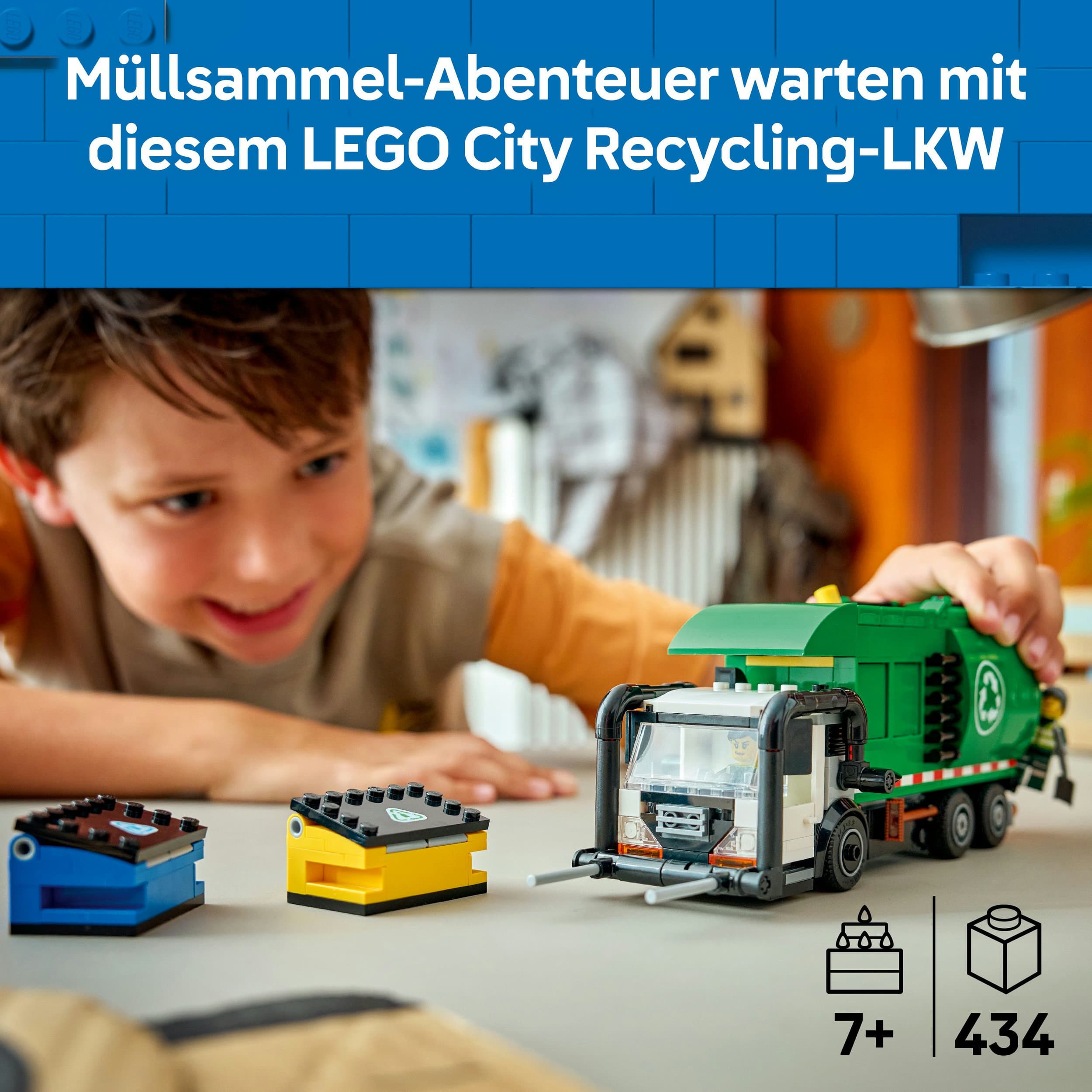 Die LEGO Builder App bietet ein intuitives Bauerlebnis mit dem LEGO Recycling-LKW aus diesem Spielset. Die 3D-Bauanleitung lässt Kinder das Modell vergrößern und drehen. In der App kann man sich auch ansehen und speichern, wie weit man mit dem Modell schon ist. Das Set besteht aus 434 Teilen.