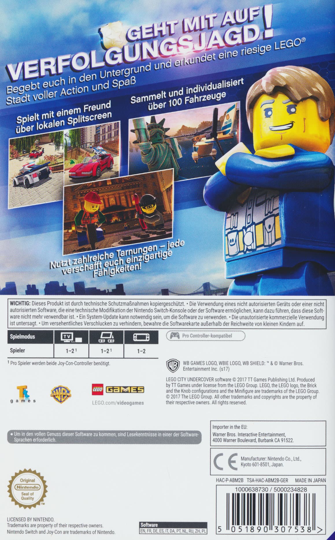 Leg´ den Schurken das Handwerk! Die Verbrechenswelle in LEGO City will einfach nicht abreißen – es wird Zeit, dass sich jemand um den niederträchtigen Schurken Rex Fury kümmert! Du übernimmst die Rolle des legendären verdeckten Ermittlers Chase McCain, der in einer offenen Spielwelt LEGO City wieder in Sicherheit vor durchtriebenen Gaunern bringen soll. Damit du dich unerkannt im Gangstermilieu bewegen kannst, solltest du dich aber perfekt tarnen: Verschiedene Outfits verleihen dir immer neue Eigenschaften, so kannst du z.B. mit der Räuberverkleidung Türen aufbrechen und Tresore knacken. Natürlich rennt die Zeit, und du musst schnellstmöglich zum jeweiligen Einsatzort gelangen – kein Problem, denn du kannst vom Hubschrauber bis zum Boot aus über 100 Fahrzeugen wählen.
