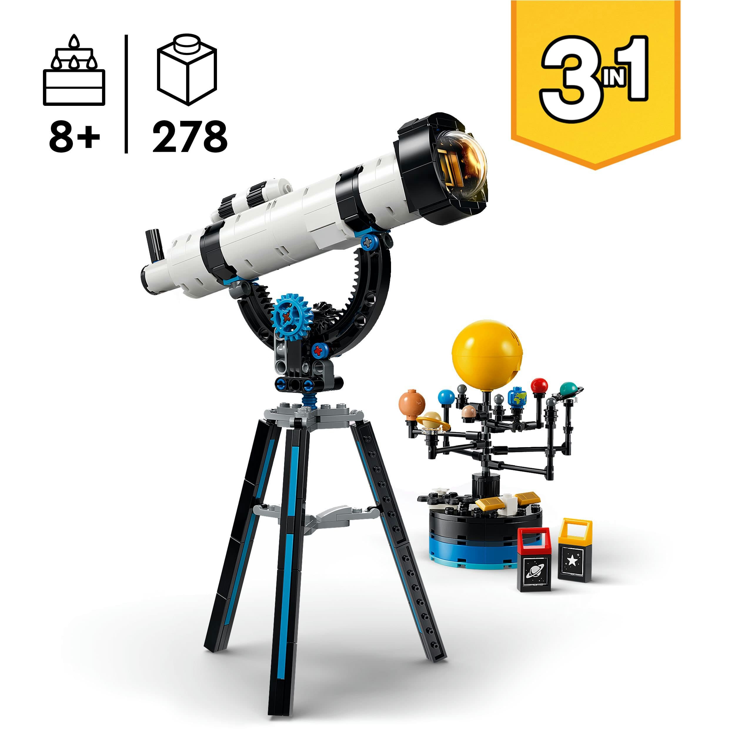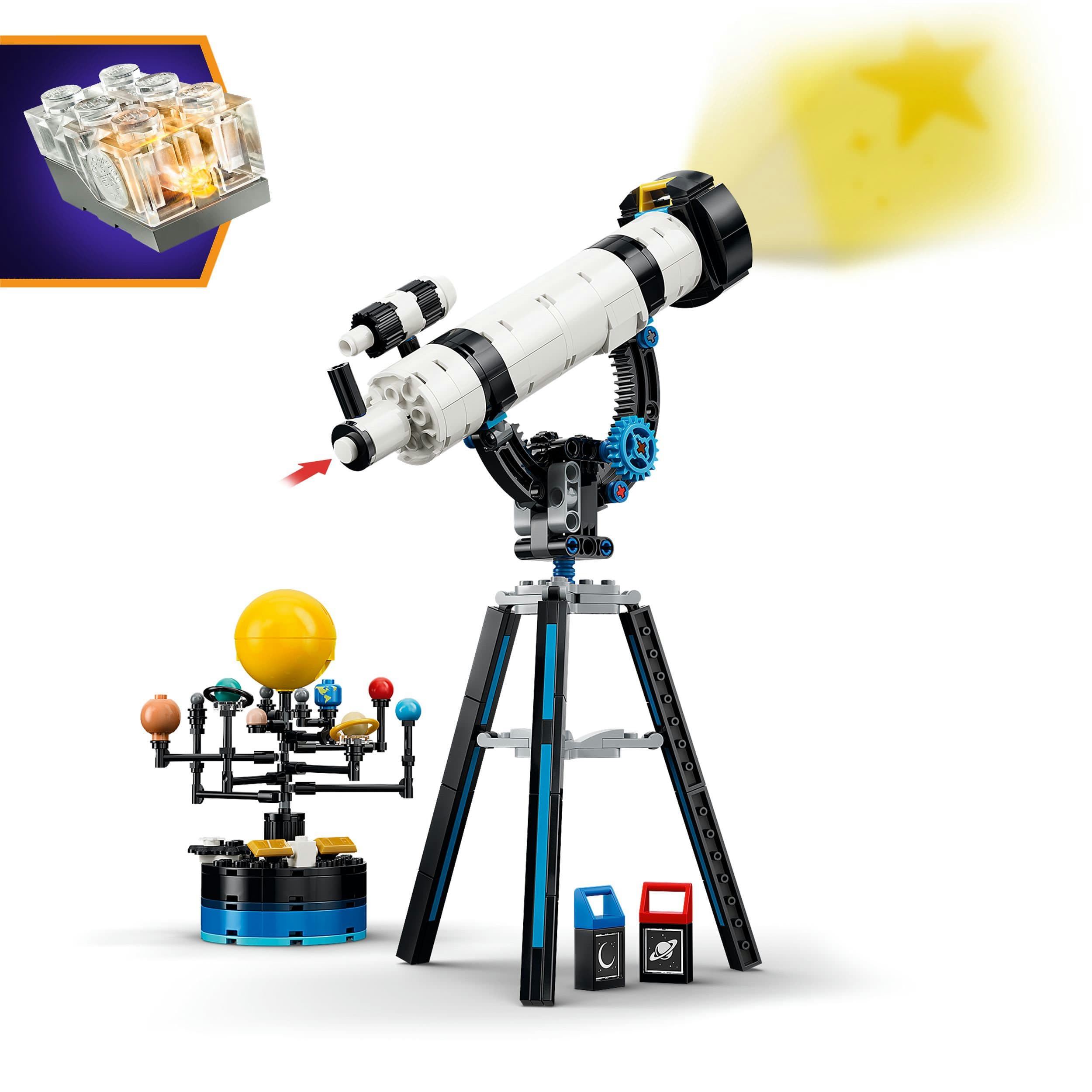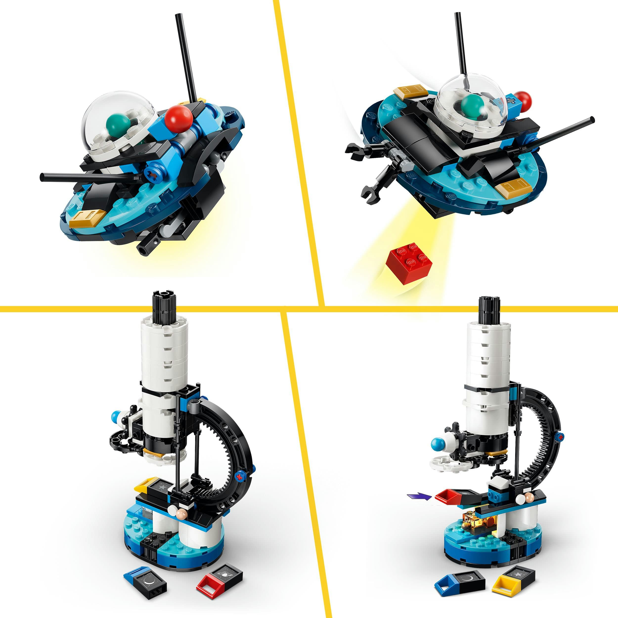 Aus denselben LEGO Steinen lassen sich drei Modelle bauen: ein verstellbares Teleskop auf einem Stativ mit einem detailreichen Modell des Sonnensystems, ein Mikroskop für wissenschaftliche Entdeckungen oder ein UFO mit beweglichen Antennen und Beinen zum Ausstellen. Dank eines integrierten Leuchtsteins (Batterien enthalten) projiziert das Teleskop Bilder auf eine Fläche, unterleuchtet das Mikroskop oder lässt das UFO einen Lichtstrahl abgeben.