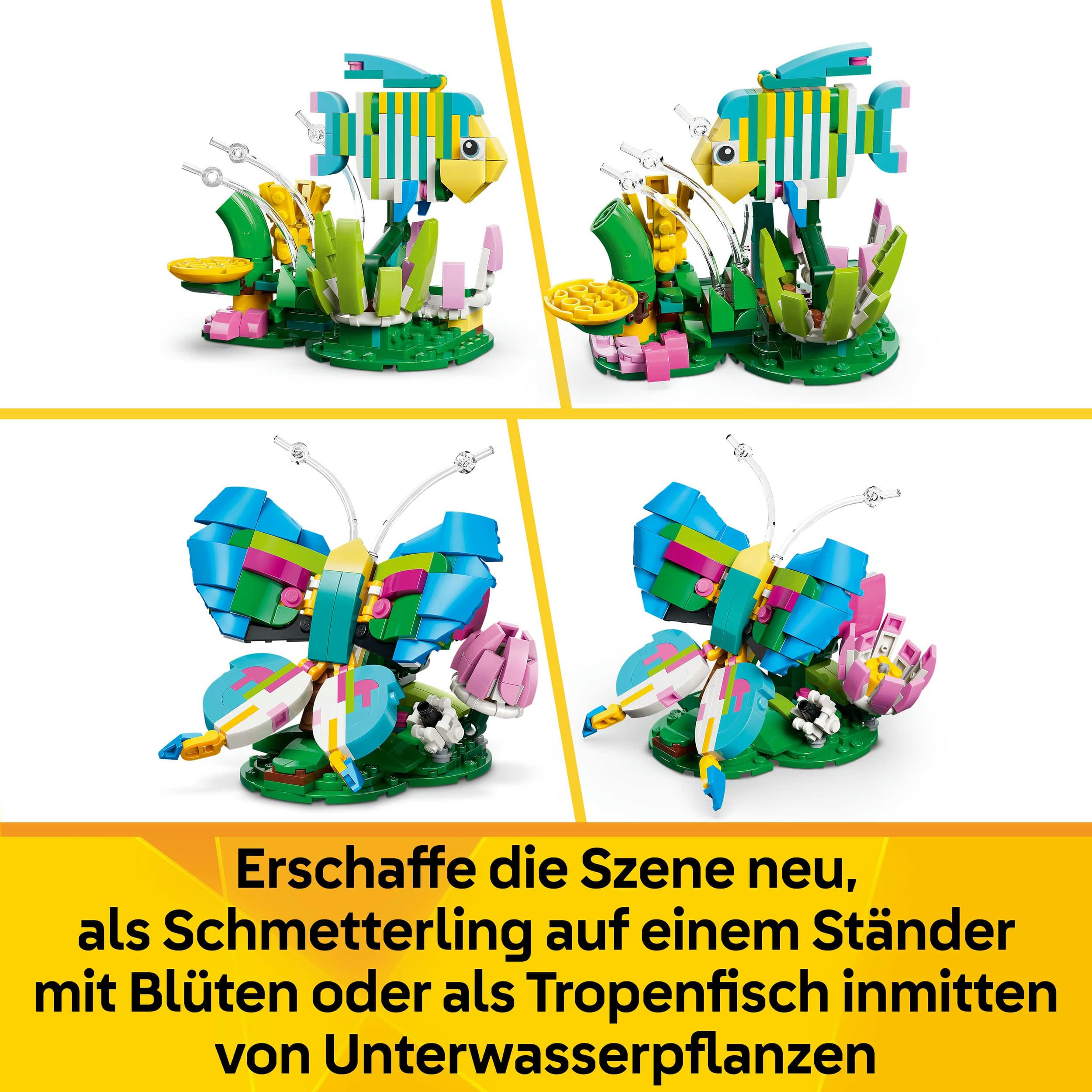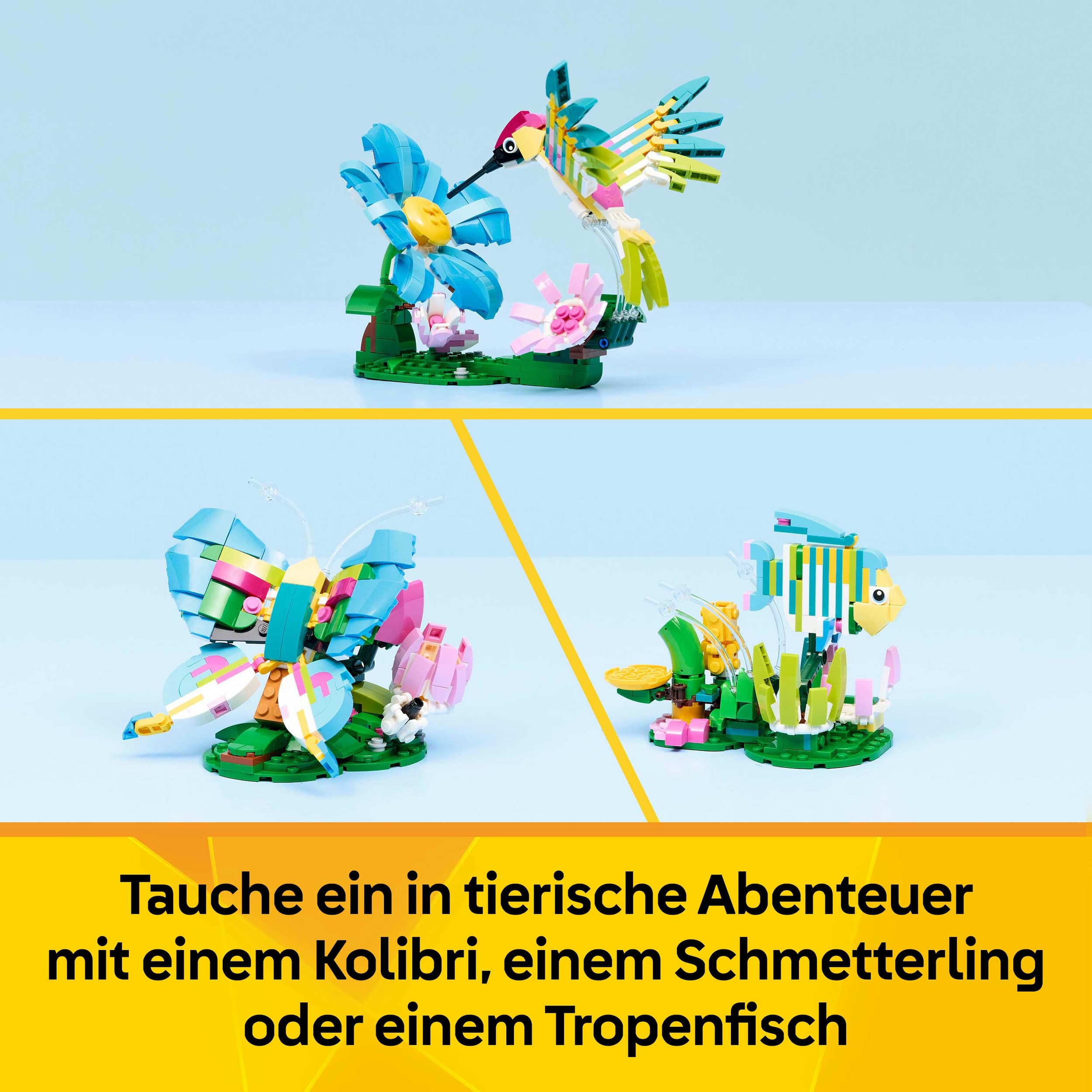 Zunächst entsteht ein farbenfroher Kolibri in dynamischer Flugpose, der sich mit seinem Schnabel über die LEGO Blumen beugt. Danach lässt sich das Modell in einen eleganten Schmetterling auf einem Ständer mit Blüten oder in einen exotischen Tropenfisch inmitten von Unterwasserpflanzen umbauen. Jedes dieser Tiere kann anschließend als farbenfrohe Kinderzimmer Deko bewundert werden.