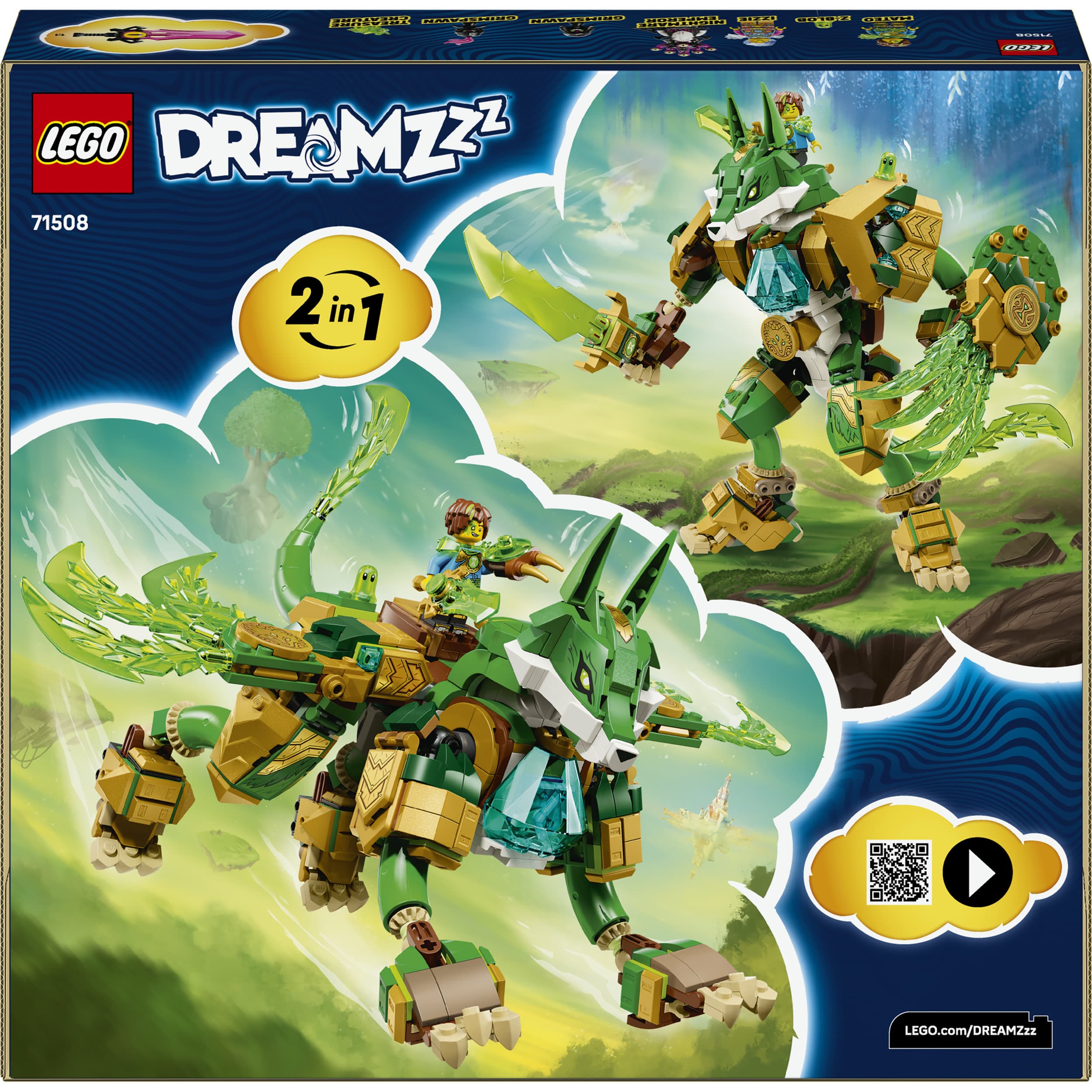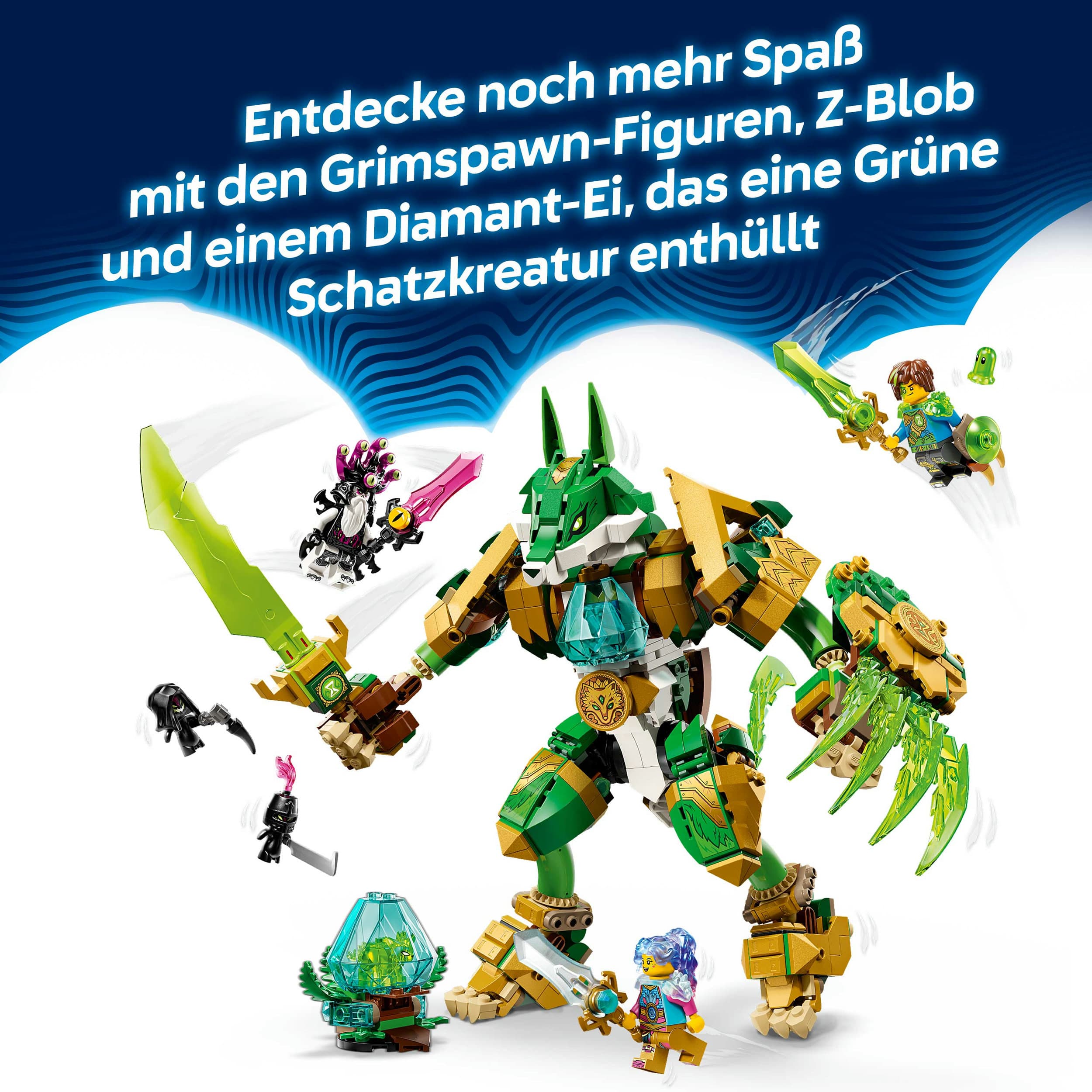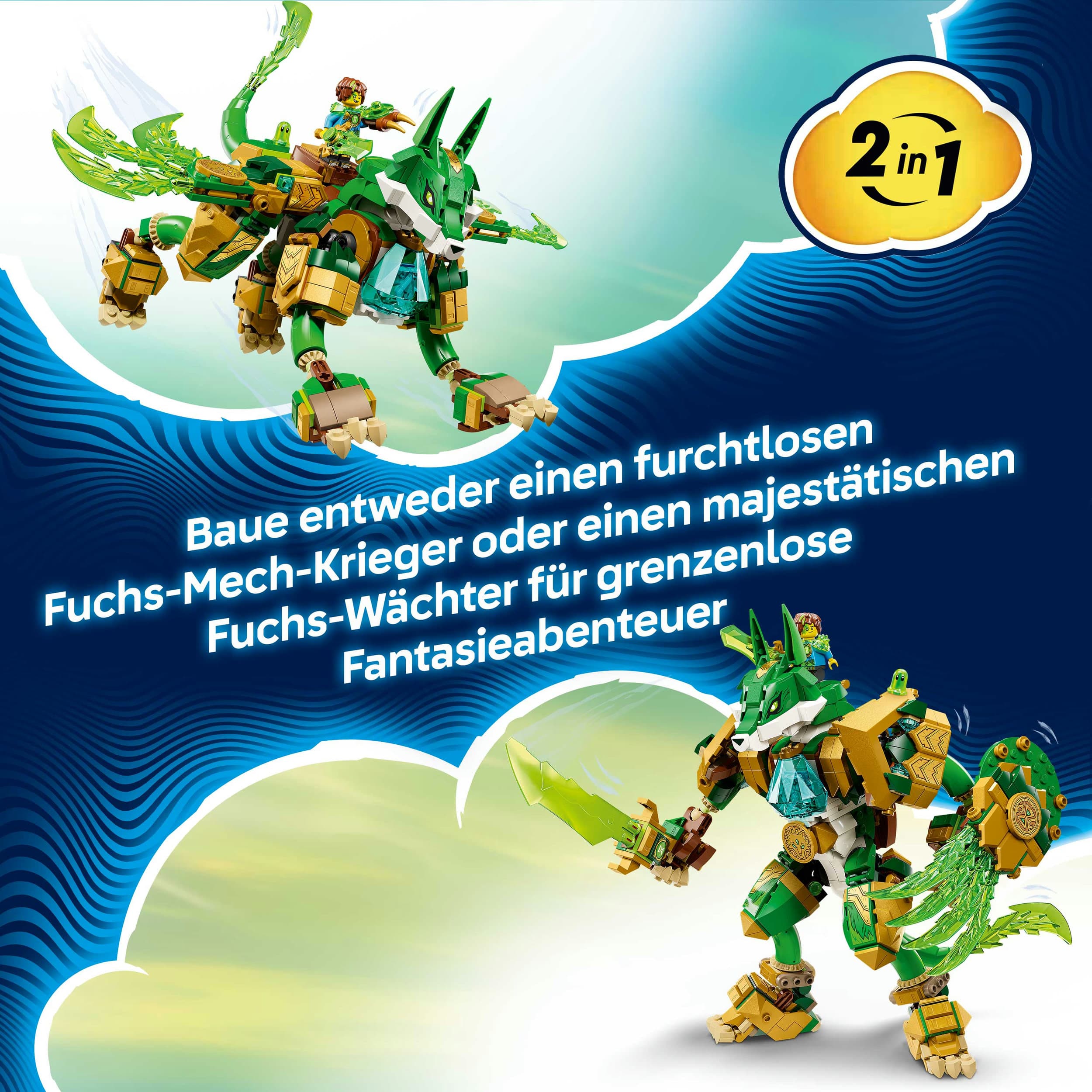 Junge Träumer können entweder einen mächtigen, auf zwei Beinen stehenden Fuchs-Mech mit Schwert und Schild oder einen majestätischen Fuchs-Wächter auf vier Beinen und mit Flügeln erschaffen. Bauspaß ist auf jeden Fall garantiert. Mateo, Izzie und der Albtraumkaiser laden zu vielen Rollenspielen ein. Jede dieser Minifiguren hat ein eigenes farblich zu ihr passendes Schwert. Kinder werden auch mit großer Begeisterung die beiden Albgnome, Z-Blob und das Diamant-Ei entdecken, aus dem eine Grüne Schatzkreatur schlüpft.