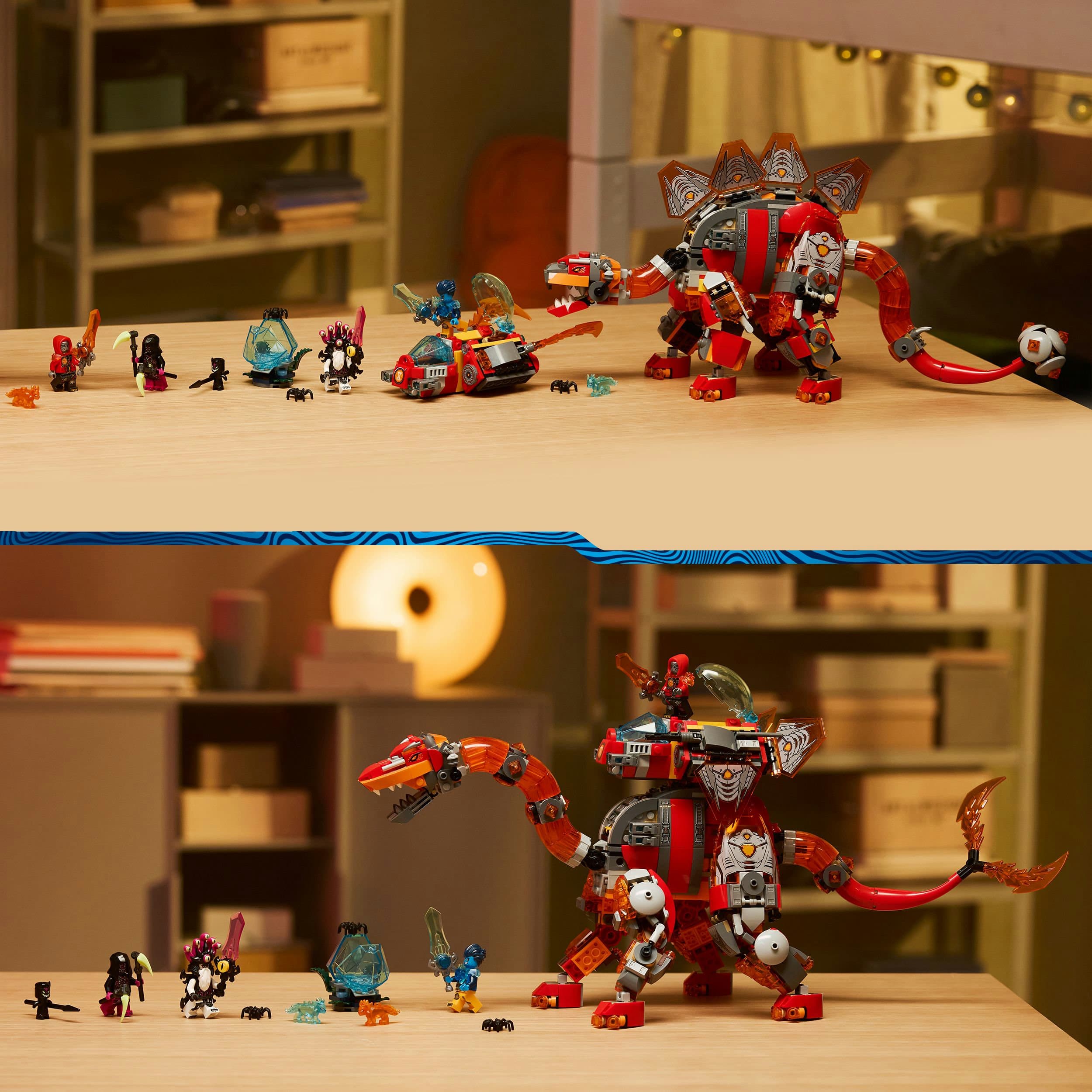 Der Brontosaurus ist ein turmhoher Dinosaurier, der aus geschmolzenem Gestein geschmiedet wird. Er hat einen gewaltigen Doppelschwanz, mit dem er alles wegpeitscht, was ihm in die Quere kommt, sowie ein abnehmbares Raumschiff. Der Stegosaurus ist dagegen eine echte Bestie mit verstärkter Panzerung, loderndem Knüppelschwanz und einem separaten Raumschiff. Zu dem Bauset gehören neben den Dinos auch 4 Minifiguren für Rollenspiele. Sie schwingen Schwerter, um 3 Spinnen zu verscheuchen. Ein Diamant-Ei sowie eine orangefarbene und eine blaue Schatzkreatur sind ebenfalls enthalten.