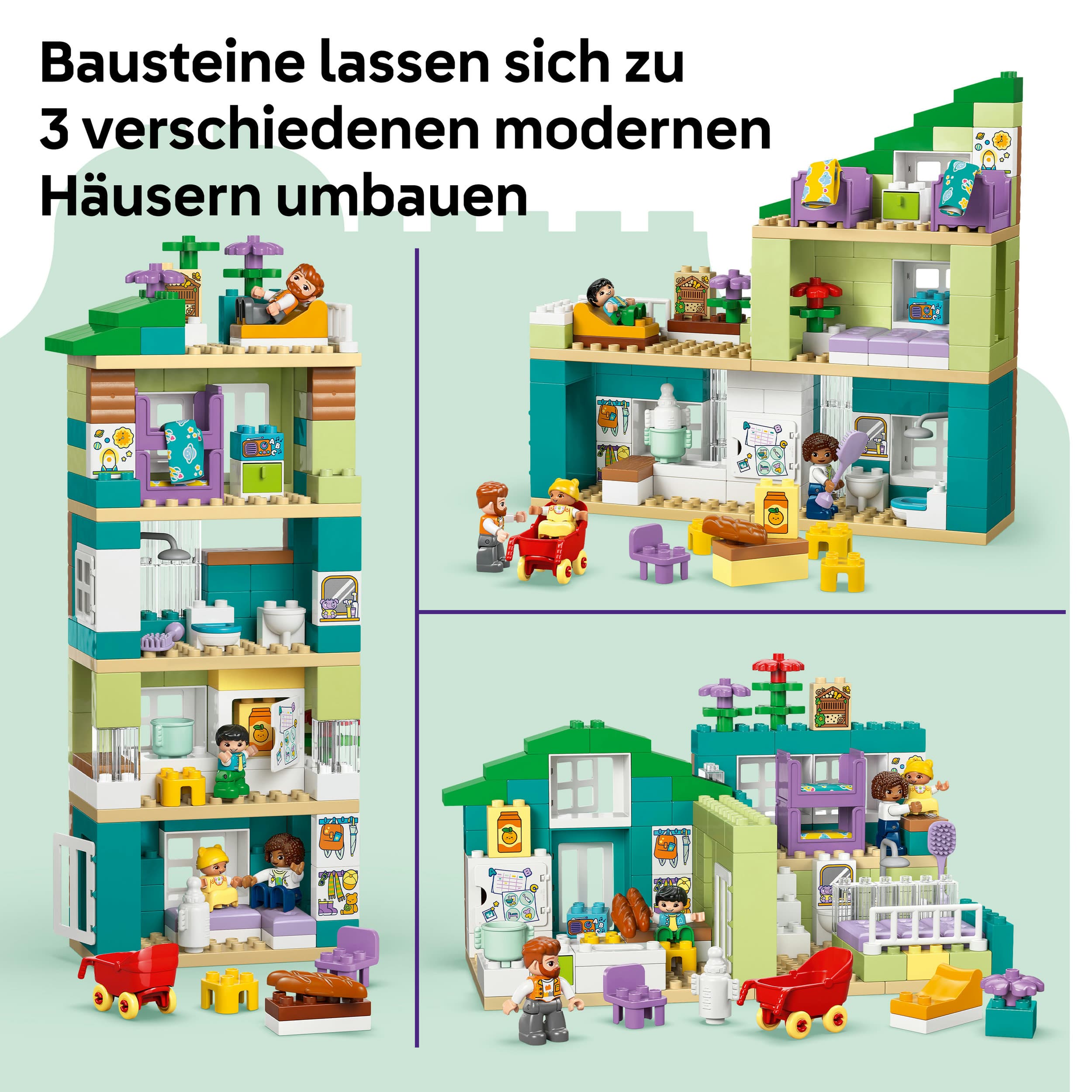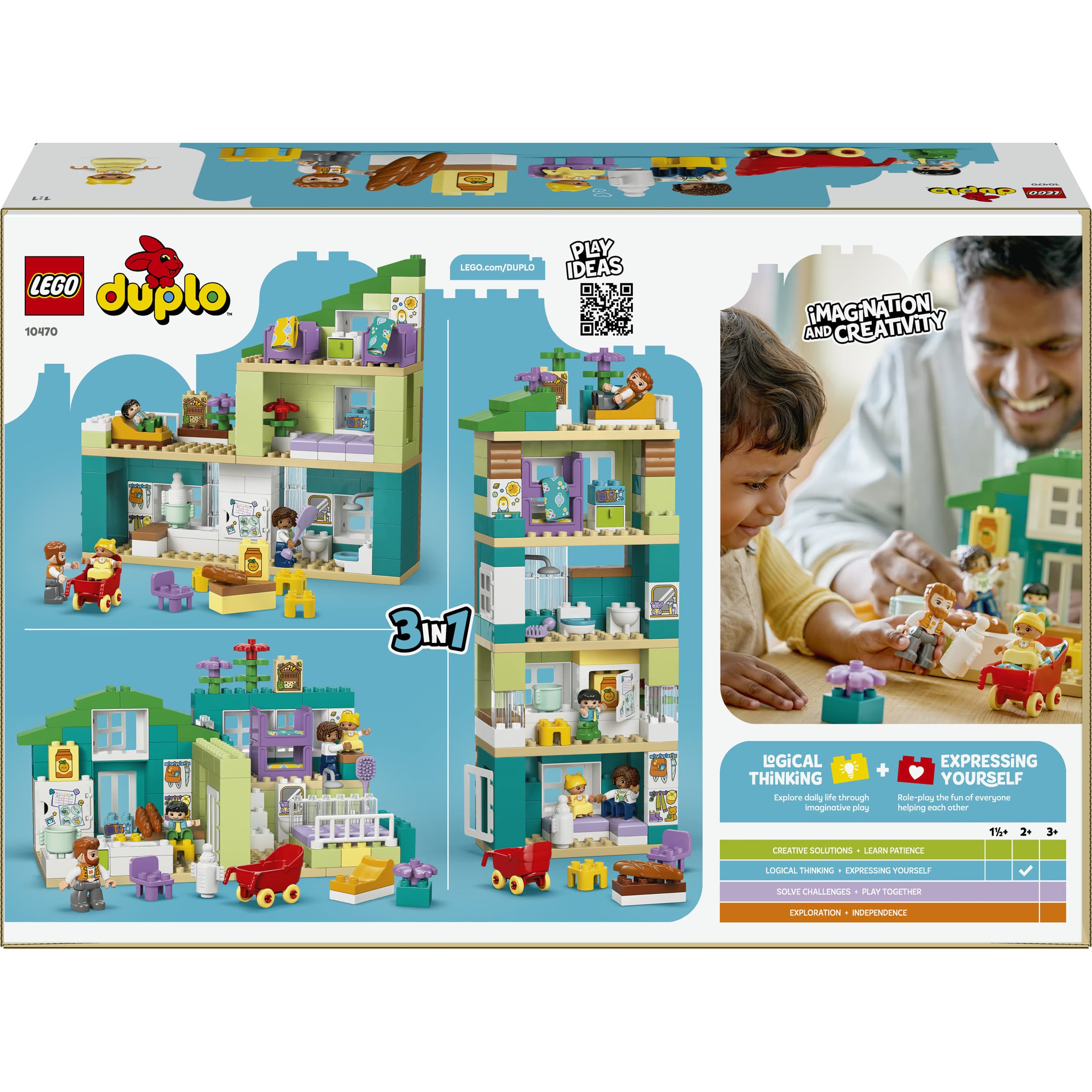 Modernes Familienhaus mit Figuren – 3-in-1-Set (10470) lässt Kleinkinder ab 2 Jahren ein Puppenhaus bauen und das Familienleben fantasievoll nachspielen. Das Spielen mit den 4 Figuren – 2 Eltern, einem Kleinkind und einem Baby – und dem Puppenhaus fördert die soziale und emotionale Entwicklung von Kleinkindern.