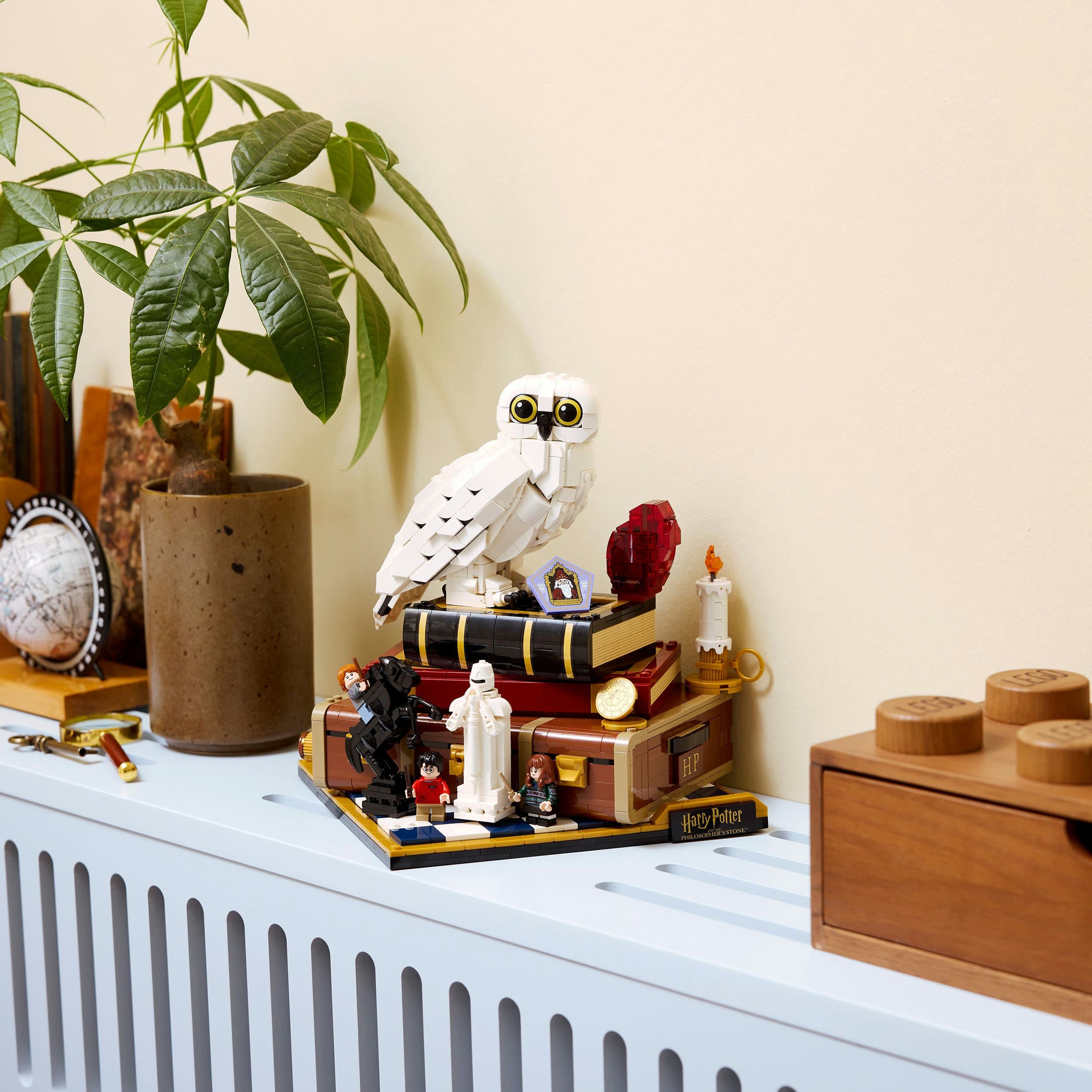 Erschaffe die erste LEGO Hedwig mit angelegten Flügeln und stelle die Schneeeule neben dem Stein der Weisen auf Harry Potters Truhe. Ergänzt wird das Set durch drei LEGO Harry Potter Figuren - Harry Potter, Hermine Granger und Ron Weasley - sowie eine Schokofrosch-Karte und ein Harry Potter Schachbrett. Diese umfangreichen Details machen den Modellbau zu einer kreativen LEGO Deko. Dreh an den drei Rädern, um Hedwigs Kopf und die Dame auf dem Schachbrett zu bewegen. Spreng die Seite der Truhe ab, um die Szene mit dem Bergtroll in der Toilette sichtbar zu machen. Weitere Mikroszenen zeigen den Hogwarts Express und die fünf Prüfungen, die Harry bestehen muss, um den Stein der Weisen zu erreichen.