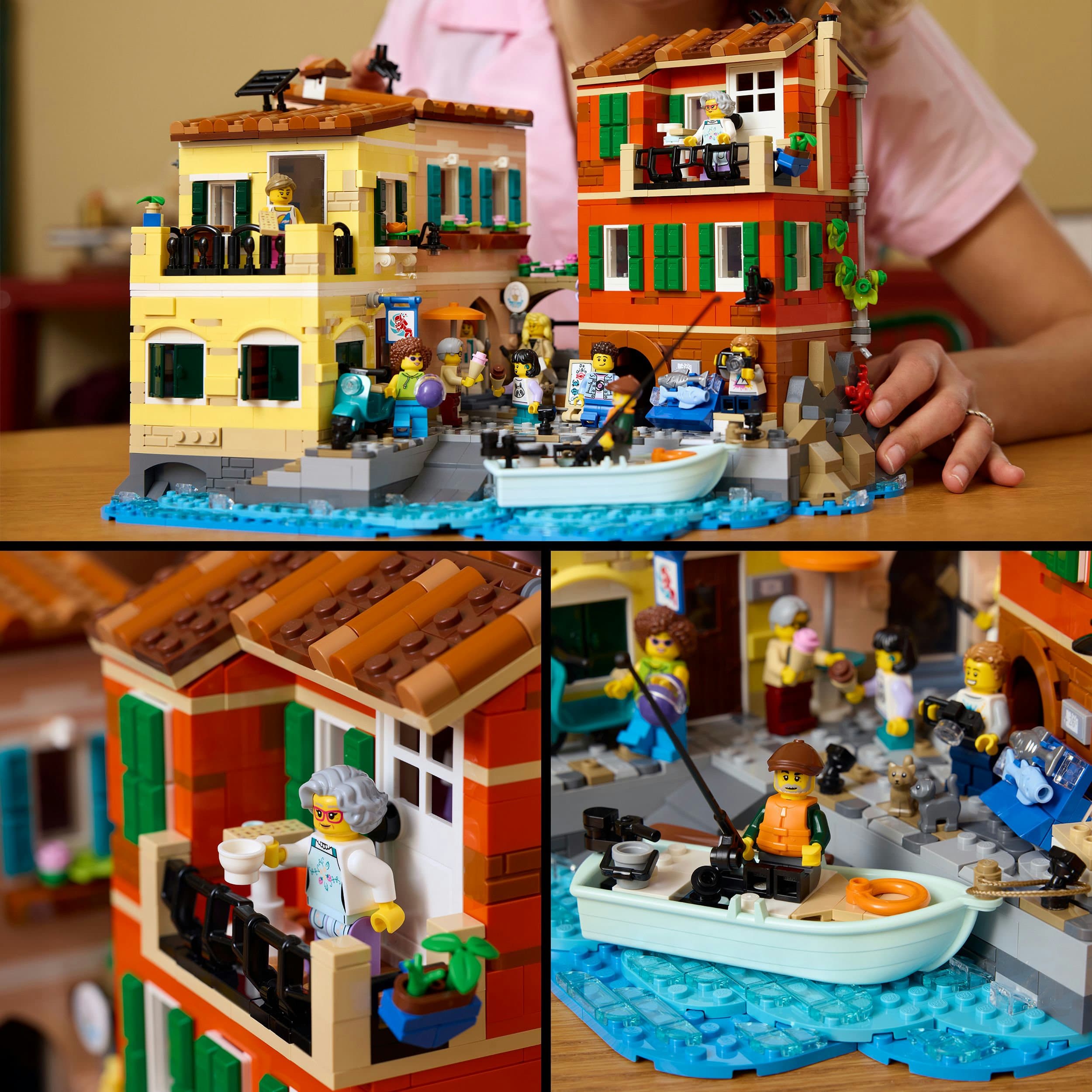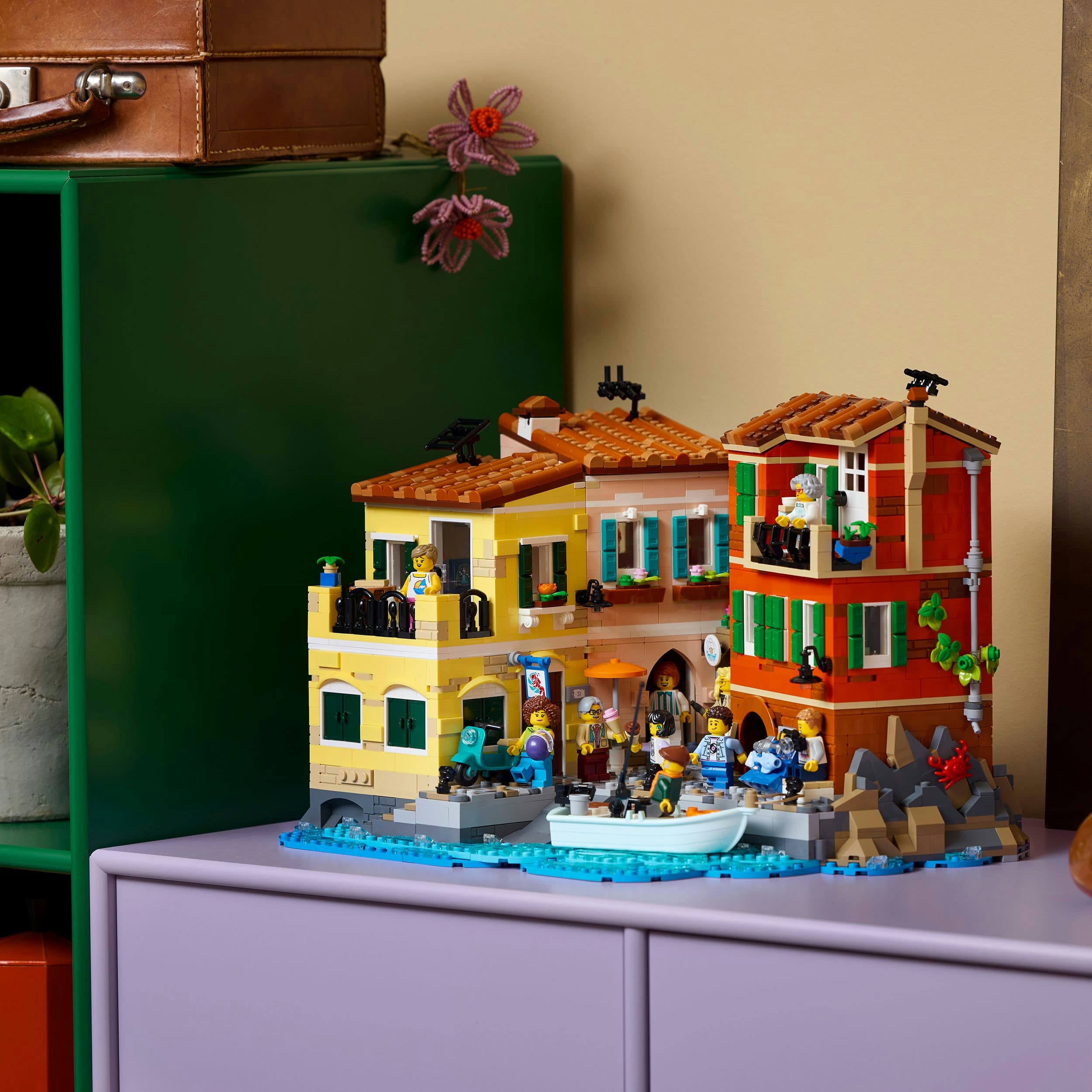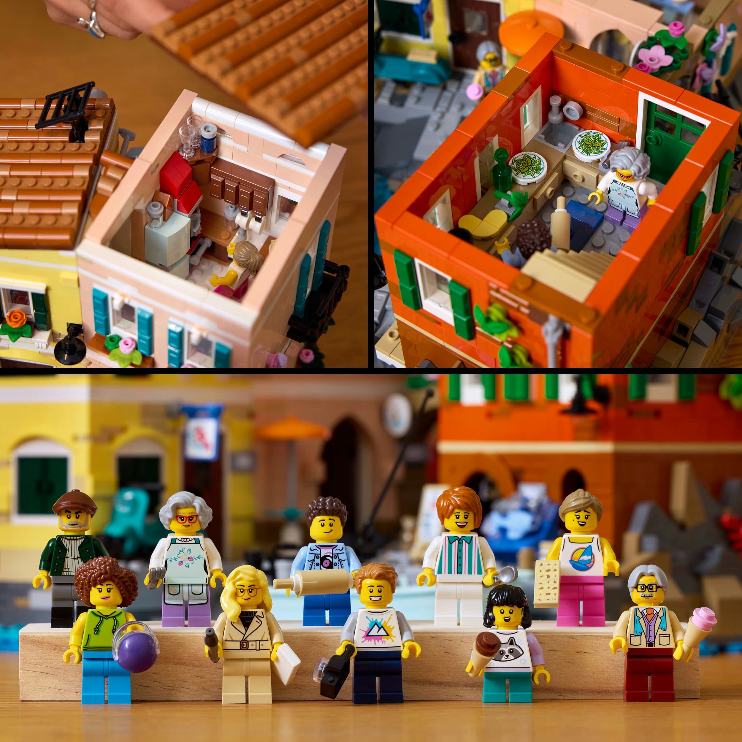 Das LEGO Set besteht aus drei Gebäuden mit abnehmbaren Dächern und Obergeschossen, die Einblicke in eine Eisdiele, einen Tauchshop, ein Fischgeschäft und die Wohnungen darüber bieten. Zehn LEGO Minifiguren beleben die Szene: vom Fischer im Boot bis zur Nonna, die ihrem Enkel Pasta macht. Ein Kätzchen stiehlt sich mit einem Fisch davon, während auf der Straße ein Rollerfahrer vorbeibraust; kleine Geschichten, die das Diorama lebendig wirken lassen.
