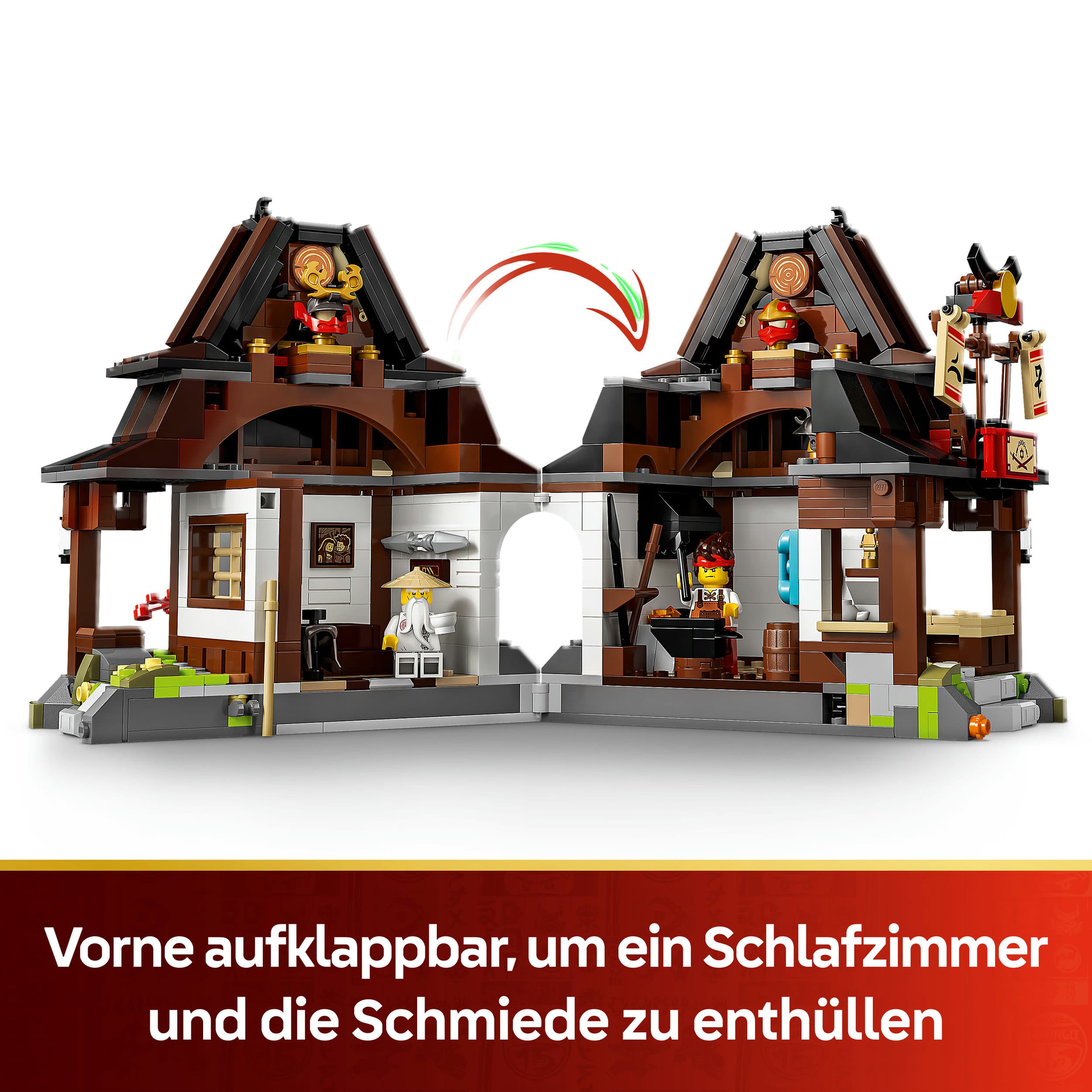 LEGO® MODELL DER SCHMIEDE: Klapp die Rückseite des fertigen Modells aus diesem Bauset auf, um ein Schlafzimmer und eine Schmiede zu enthüllen, die nur so vor Details aus Geschichte der TV-Serie strotzen und die NINJAGO® Fangemeinde begeistern