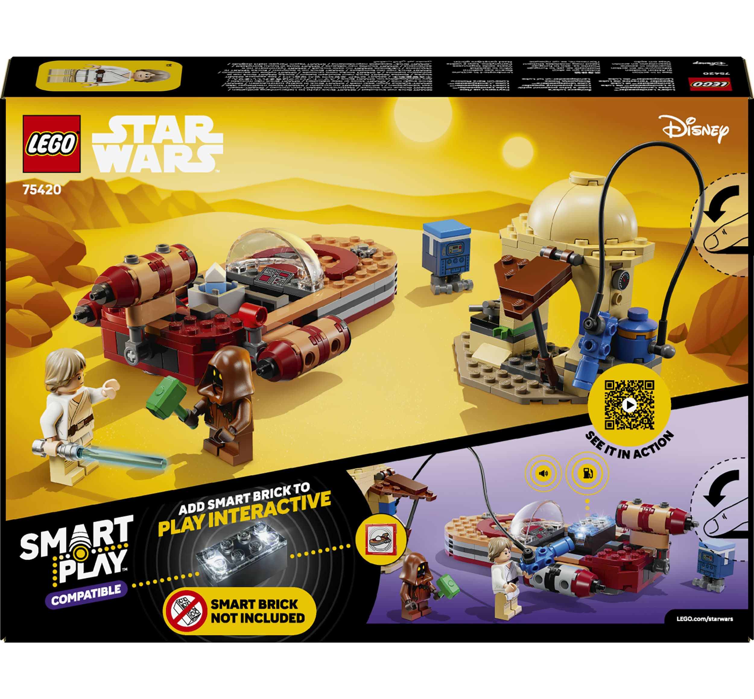 Dieses mit LEGO SMART Play kompatible Set beinhaltet einen SMART Tag sowie die LEGO Minifiguren SMART Luke Skywalker, einen Jawa und einen Gonk-Droiden. Mit einem SMART Brick aus den All-in-1-Sets 75421, 75423 oder 75427 (alle separat erhältlich) können die Bewegungen von SMART Luke Skywalker durch Licht- und Soundeffekte besonders realistisch zum Leben erweckt werden.
