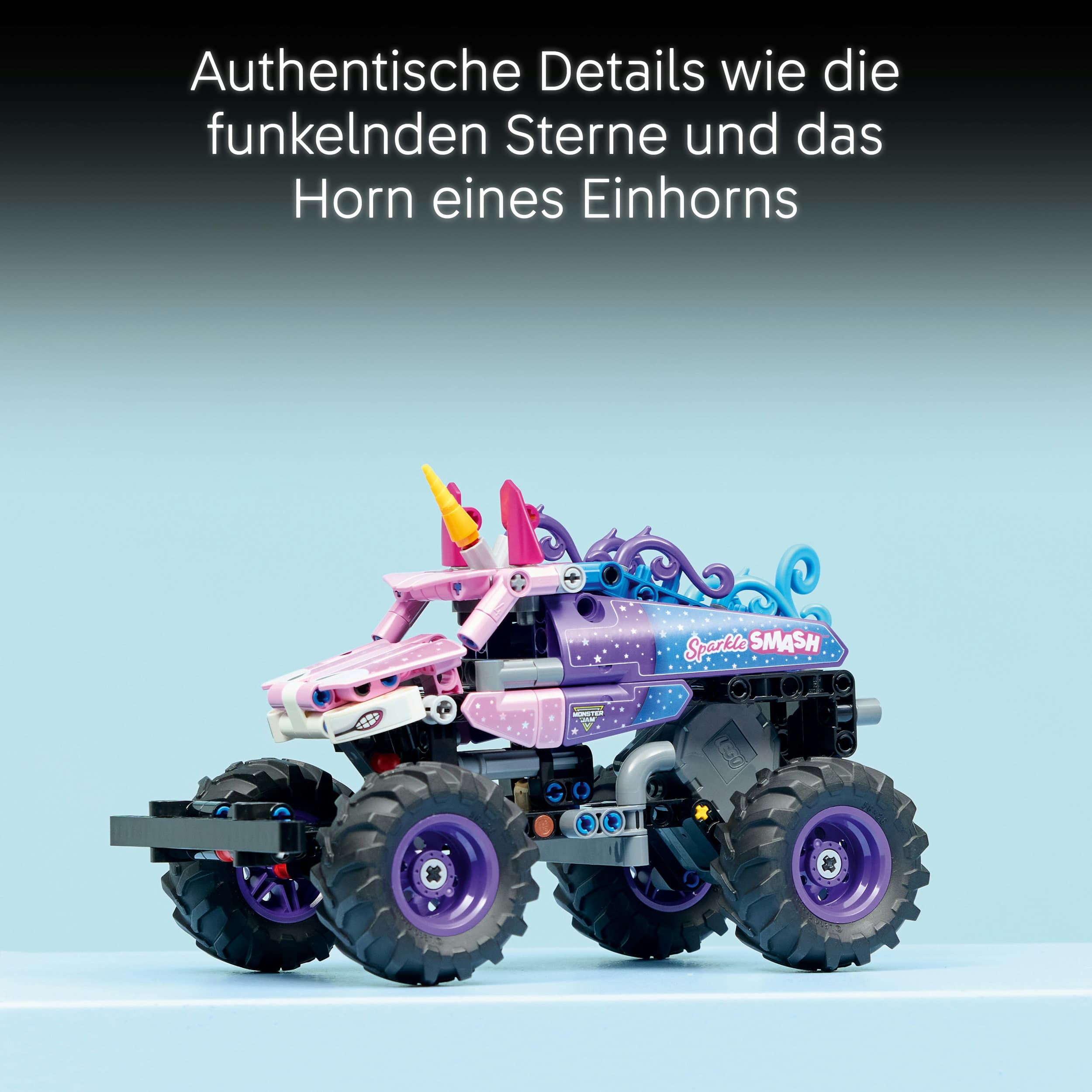 Genau wie der echte Sparkle Smash verfügt auch dieser detailgetreu nachgebildete Einhorn-Monstertruck über authentische Details wie die funkelnden Sterne und das legendäre Horn eines Einhorns. Dieser Monstertruck zum Bauen und Spielen ist eine tolle Geschenkidee für Jungen, Mädchen und alle Kinder, die LEGO® Flitzer, Autos mit Rückziehmotoren und die Faszination der atemberaubenden Monster-Jam-Events lieben.