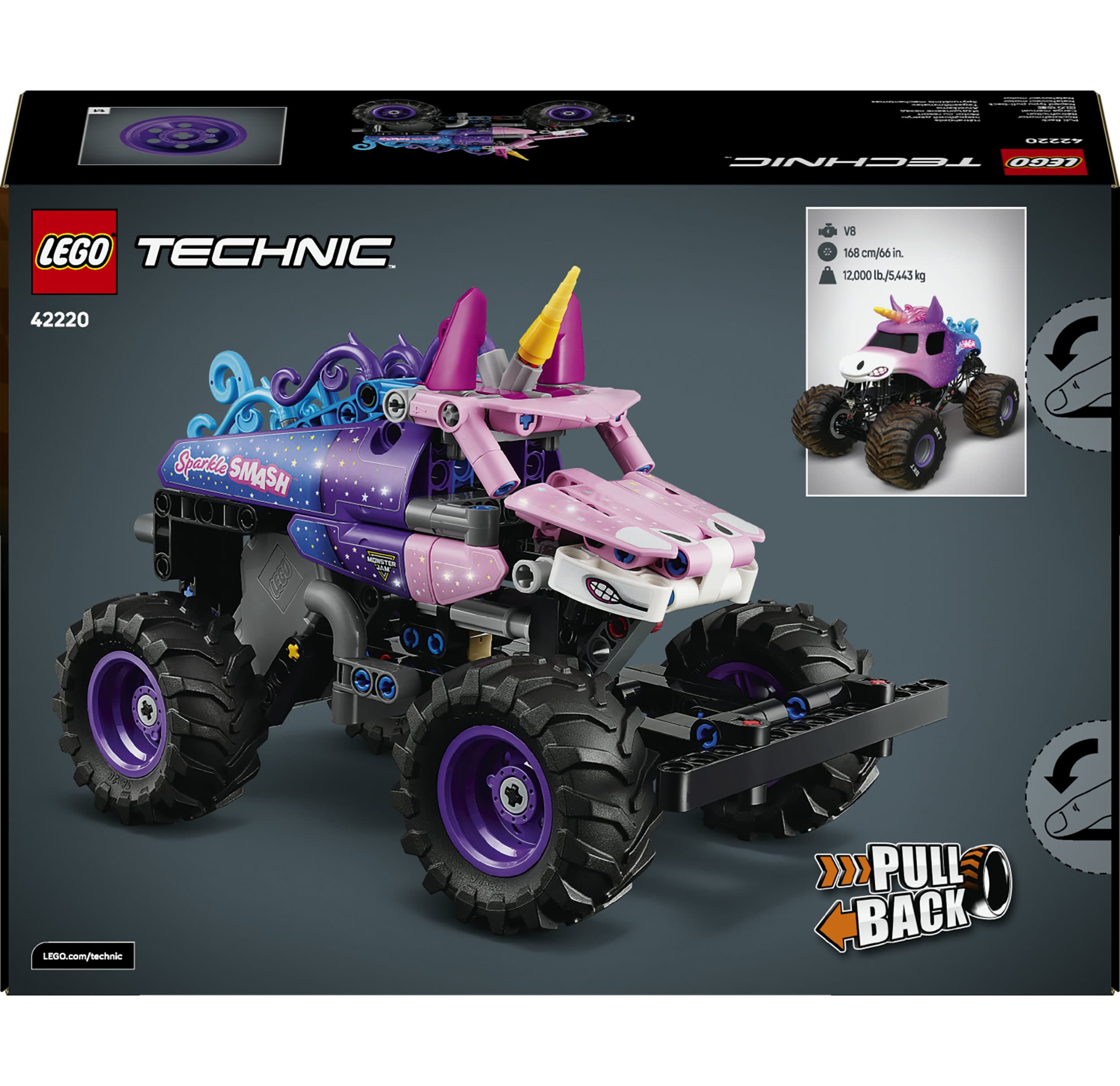 Dieser Monstertruck mit Rückziehmotor lässt Jungen und Mädchen ab 7 Jahren den spektakulären Actionspaß des Monster Jam™ nachspielen. Benutze die coole Rückziehfunktion, um den Sparkle Smash™ (42220) losbrausen und die spektakulären Stunts legendärer Monstertrucks vorführen zu lassen.