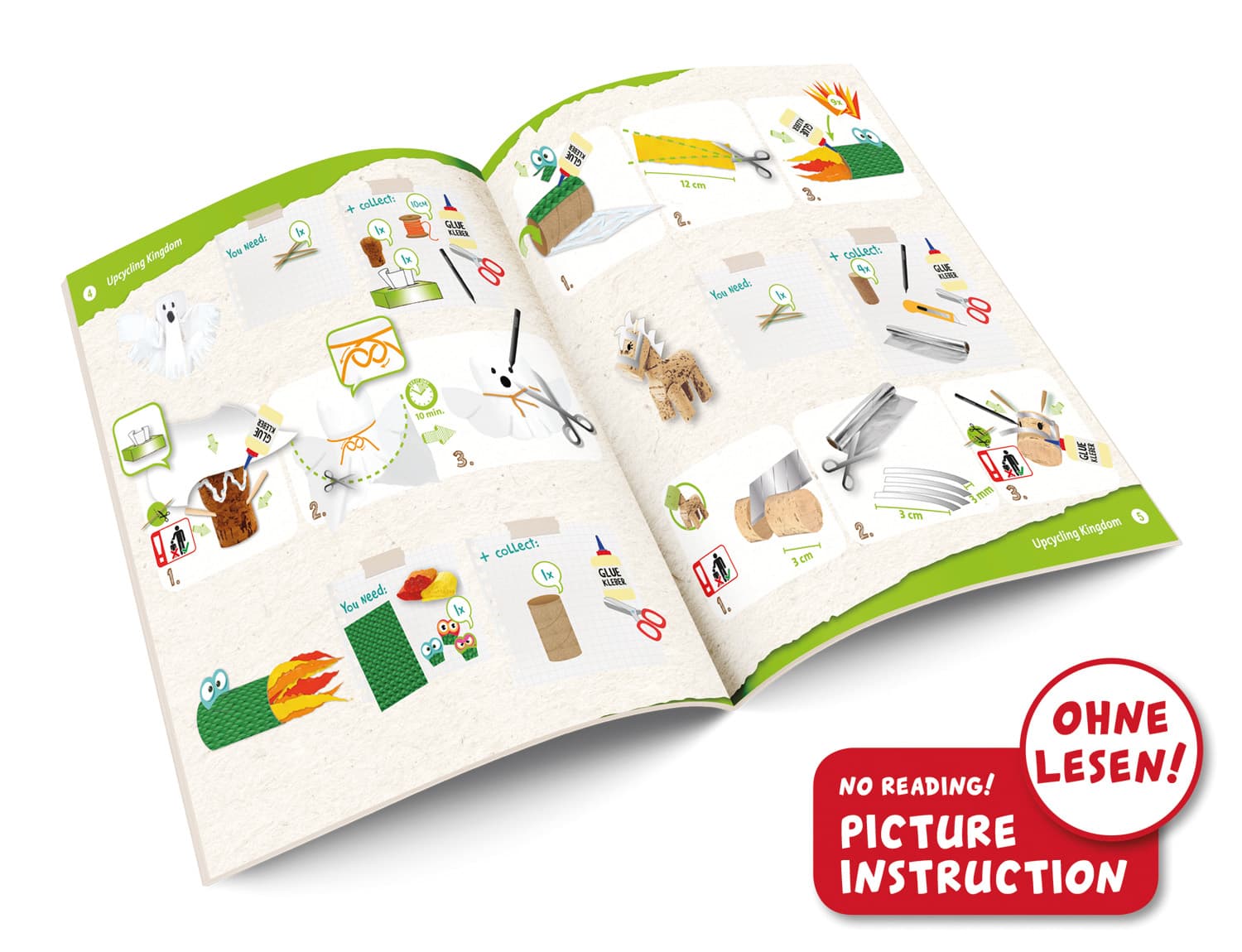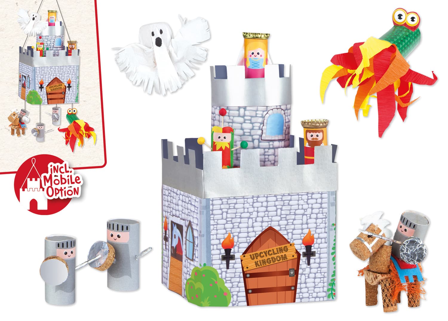 LENA Eco Upcycling Kingdom. Mit einem Kronkorken gekrönt herrscht der König dieses Upcycling-Bastelsets über seine Ritterburg inkl. Bewohner und einem Drachen. Mit Vorlage für 2 Rittermasken aus Verpackungsmaterial. Mit Storybook und ausführlicher, farbiger Anleitung. Geeignet für Kinder ab 6 Jahren. Verpackt in bunter Aufbewahrungsbox & Banderole mit Produktinformationen. Papier-Bastelsets, Textiles Gestalten