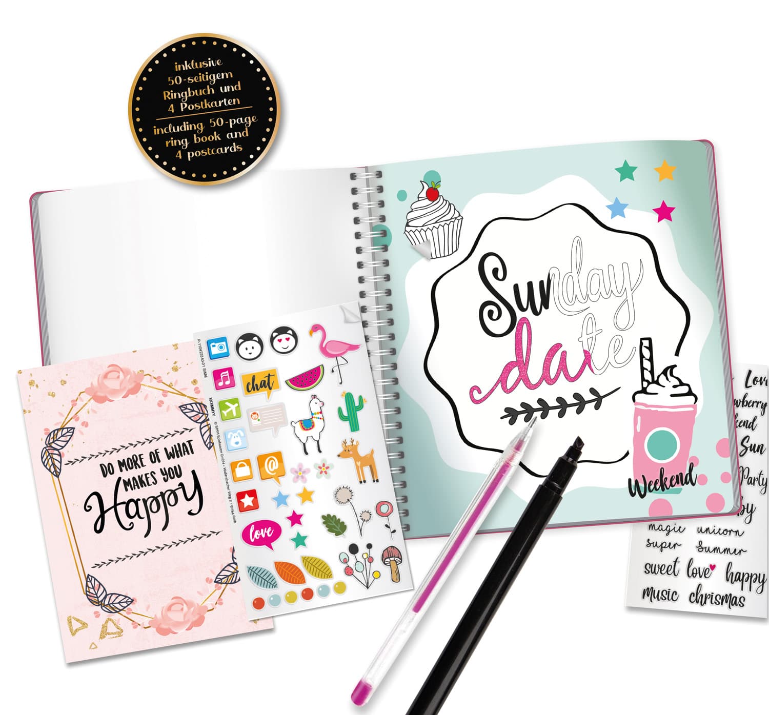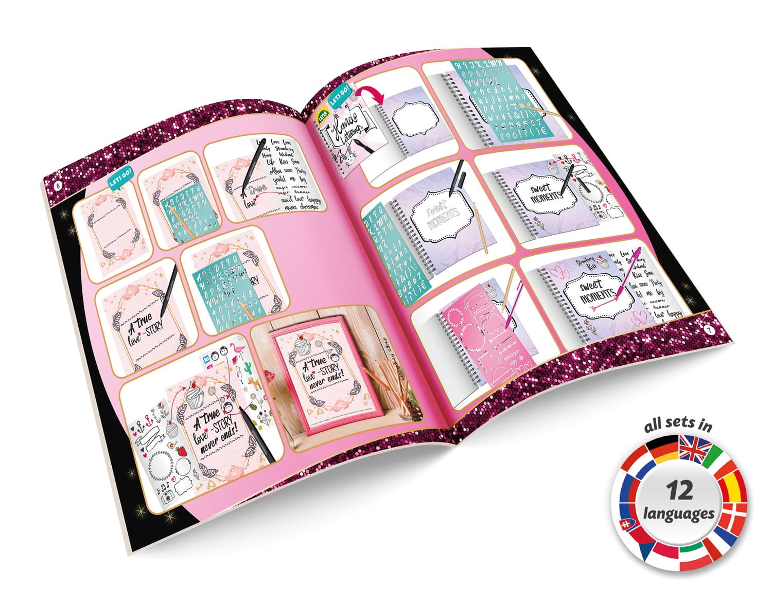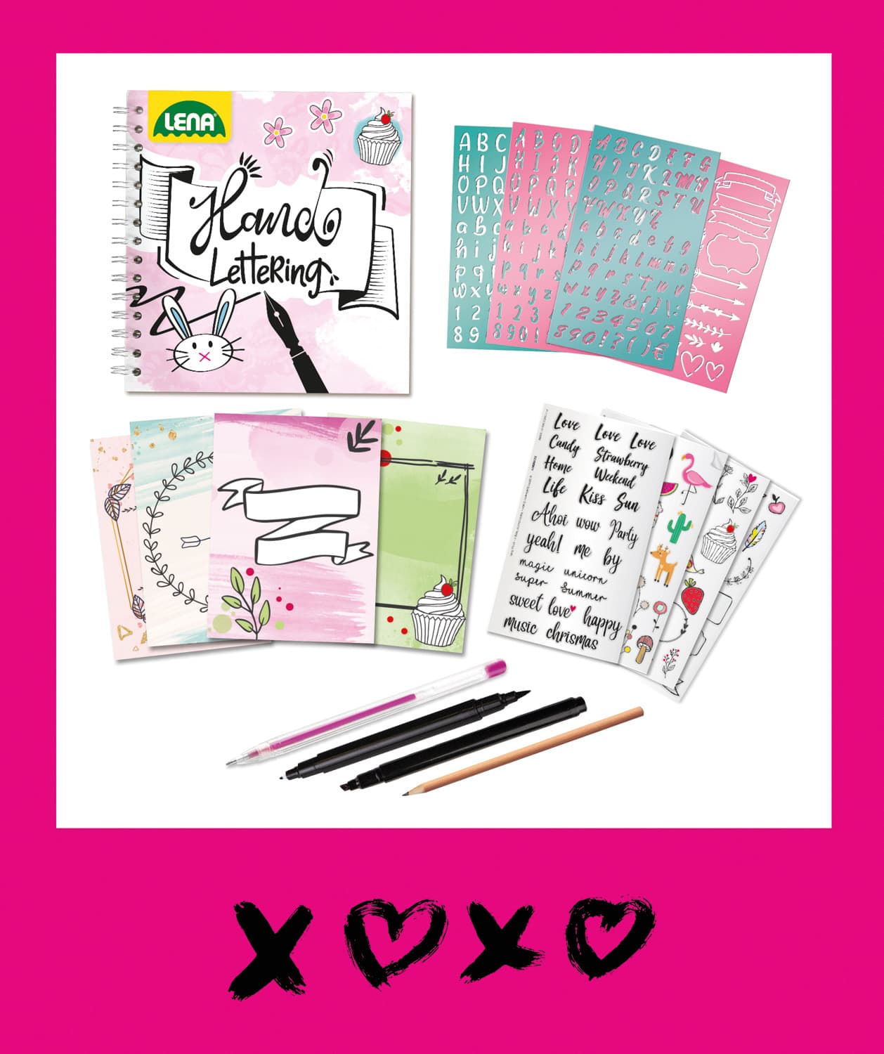 LENA® Handlettering. Ein Buch und Karten, welche mit Fotos, Ausschnitten aber vor allem Sprüchen und Skizzen im trendigen Handlettering-Style selbst gestaltet werden können. Set enthält 2 schwarze Stifte, einer davon mit 2 Spitzen und einen Bleistift, 4 Schablonen zum Erlernen von 3 Schriftarten, Ringbuch mit Vordrucken, 4 Postkarten und 4 Sticker-bögen mit coolen Motiven. Mit ausführlicher, farbiger Anleitung. Geeignet für Kinder ab 8 Jahren. Verpackt in bunter Aufbewahrungsbox & Banderole mit Produktinformationen.