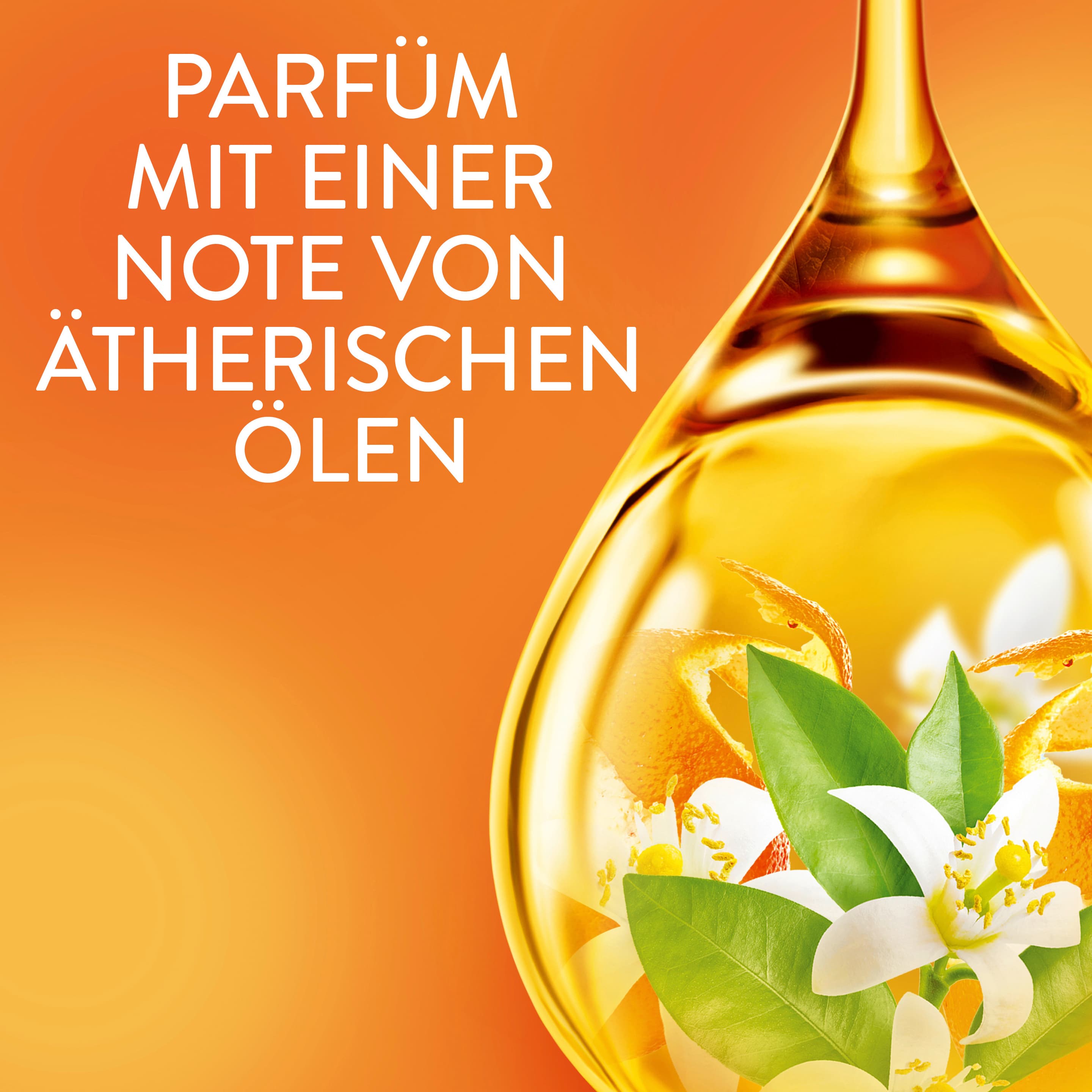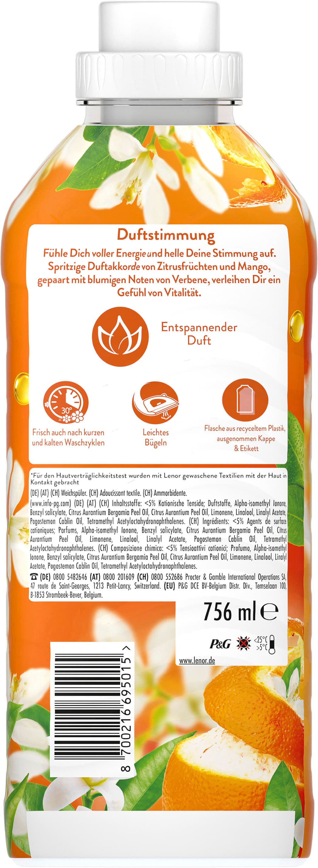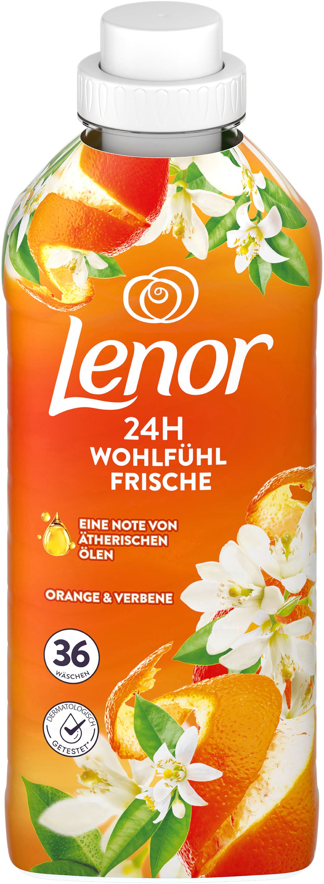 Der Lenor Weichspüler Orange & Verbene sorgt für 24 Stunden Wohlfühlfrische und tagsüber für kleine Momente der Entspannung. Der Duft ist mit einer Note ätherischer Öle versehen. Fühle Dich voller Energie und verbessere Deine Stimmung auf. Spritzige Duftakkorde von Zitrusfrüchten und Mango, gepaart mit blumigen Noten von Verbene, verleihen Dir ein Gefühl von Vitalität.