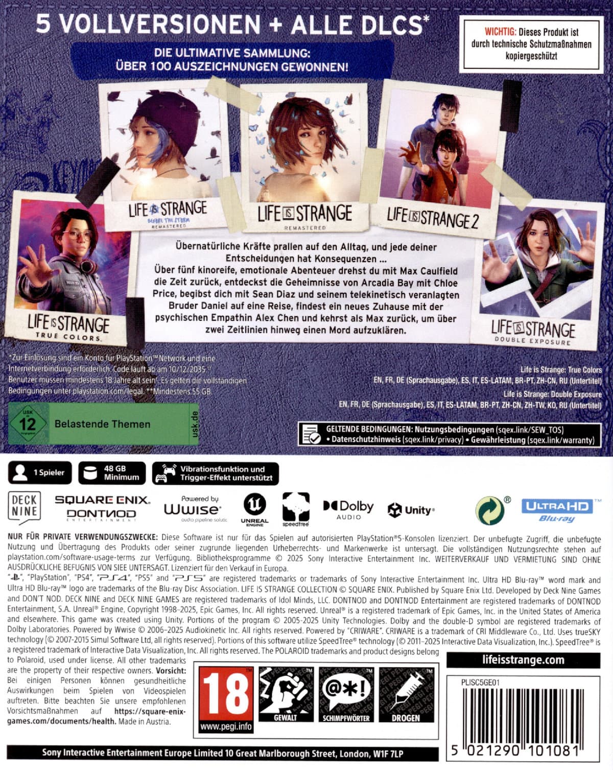 Über fünf kinoreife, emotionale Abenteuer drehst du mit Max Caulfield die Zeit zurück, entdeckst die Geheimnisse von Arcadia Bay mit Chloe Price, begibst dich mit Sean Diaz und seinem telekinetisch veranlagten Bruder Daniel auf eine Reise, findest ein neues Zuhause mit der psychischen Empathin Alex Chen und kehrst als Max zurück, um über zwei Zeitlinien hinweg einen Mord aufzuklären.