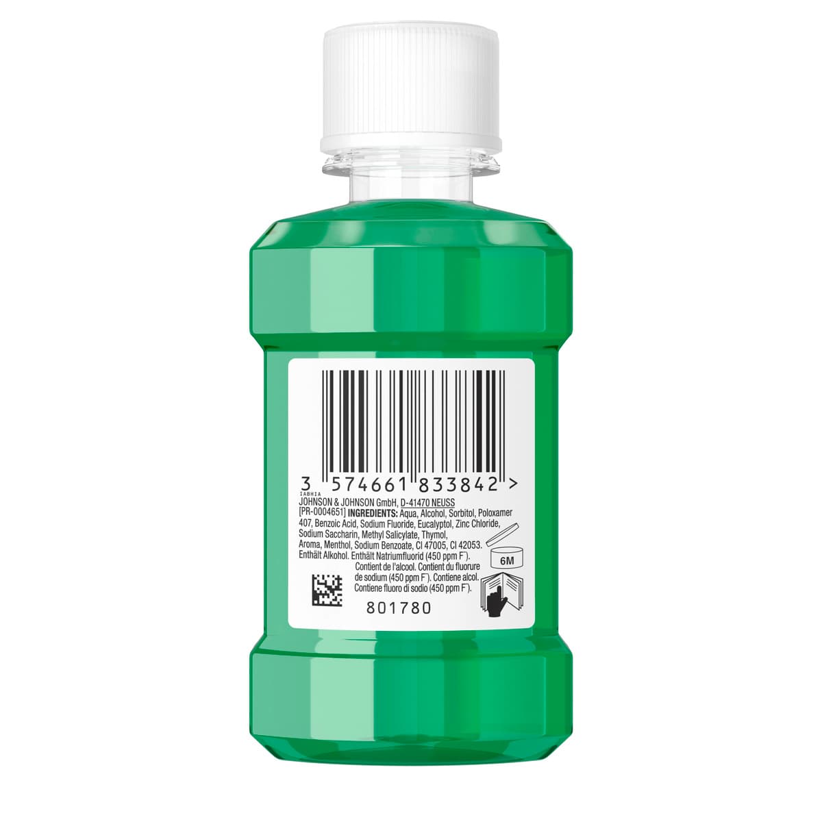 | Inhaltsstoffe | Aqua, Alcohol, Sorbitol, Poloxamer 407, Benzoic Acid, Sodium Fluoride, Eucalyptol, Zinc Chloride, Sodium Saccharin, Methyl Salicylate, Thymol, Aroma, Menthol, Sodium Benzoate, CI 47005, CI 42053. Enthält Alkohol. Enthält Natriumfluorid (450 ppm F¯) |