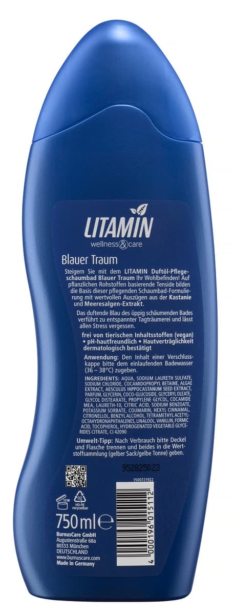 Das Litamin Wellness & Care Duftöl-Pflegeschaumbad Blauer Traum verwandelt jedes Bad in einen Moment der Entspannung. Die Formulierung reinigt die Haut sanft und hüllt den Körper in einen üppigen, langanhaltenden Schaum.