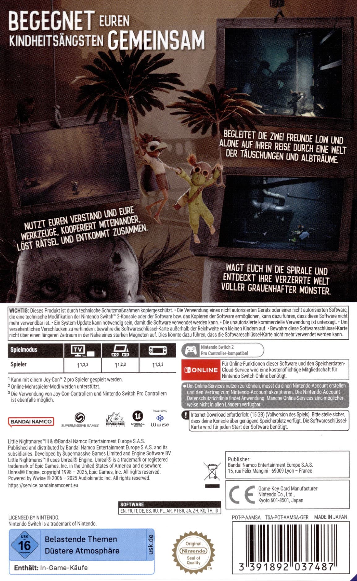 Begib dich auf ein neues Abenteuer in der einzigartigen Welt von Little Nightmares. In Little Nightmares III hilfst du Low & Alone auf ihrer Suche nach einem Weg aus dem Nirgendwo. Die zwei Freunde sind in der Spirale gefangen, einem Füllhorn an verstörenden Orten, in der sie zusammenarbeiten müssen, um in einer gefährlichen Welt aus Illusionen zu überleben und einer noch größeren Bedrohung zu entkommen, die in den Schatten lauert. Zum ersten Mal in der Geschichte der Reihe begegnest du deinen Kindheitsängsten gemeinsam mit einem Freund im Online-Koop oder alleine mit der KI. STELLT EUCH GEMEINSAM EUREN KINDHEITSÄNGSTEN Ihr spielt als Low und Alone, zwei beste Freunde, die einander in diesem einsamen Albtraum gefunden haben. Jeder der beiden besitzt einen eigenen, besonderen Gegenstand: Low einen Bogen und Alone einen Schraubenschlüssel. Sie arbeiten stets zusammen und haben gelernt, durch versteckte Pfade zu schleichen, einander über große Hindernisse hinwegzuhelfen und aufeinander aufzupassen. Ob ihr nun mit einem Freund oder der K.I. zusammenspielt, ihr seid von einander und euren besonderen Gegenständen abhängig, um Gelegenheiten zu schaffen und so voranzukommen. Die Umgebung steckt voller Hinweise und Möglichkeiten welche fantasievolle Kinder ausnutzen können. Lows Pfeile können höhergelegene Ziele erreichen und Alones Schraubenschlüssel ist perfekt, um benommene Gegner zu erledigen, Barrieren zu durchbrechen oder riesige Maschinen zu manipulieren. BEGEBT EUCH AUF EIN FESSELNDES UND VERSTÖRENDES ABENTEUER Wo ihr auch hingeht, das Nirgendwo steckt voller schrecklicher Monster. Die Bewohner scheuen keine Mühen, um kleine, störende Besucher einzufangen, die zu viel Aufmerksamkeit auf sich ziehen. Mitunter müsst ihr angsteinflößende Versteckspiele mit einem Monster-Baby in den sandigen Ruinen von Nekropolis spielen, mit viel Mühe den Schwärmen von Süßigkeiten-Käfern in der verstörenden Süßigkeitenfabrik entkommen oder riesigen Füßen ausweichen, während ihr über regennasse Promenaden eines dreckigen Jahrmarktes rennt. Ihr müsst stets bereit sein, zu rennen, euch zu verstecken oder euch sogar zu verteidigen, um am Leben zu bleiben. VERSINKT IN DER SPIRALE Lasst euch nicht zu sehr von der verstörenden Schönheit des Nirgendwo ablenken. Dunkle Geheimnisse erwarten euch, während Low und Alone dem Spiegelpfad durch die Spirale folgen. Dabei wird jeder Ort kontinuierlich gefährlicher und düsterer als der davor und traumatische Erinnerungen beginnen aufzublitzen. Werden Low und Alone endlich aus dem schier endlosen Albtraum entkommen? Nur du kannst den beiden helfen …
