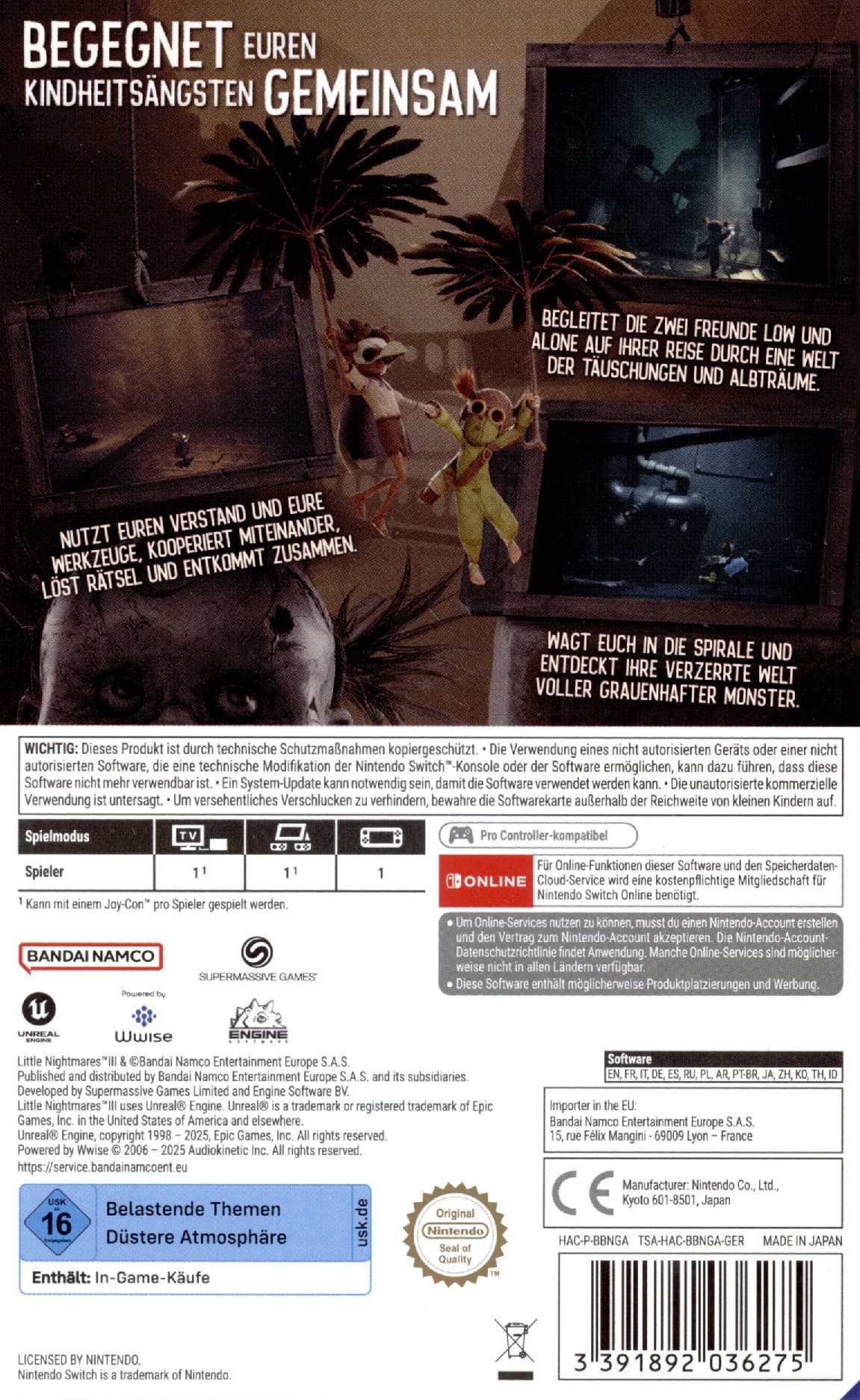 Begib dich auf ein neues Abenteuer in der einzigartigen Welt von Little Nightmares. In Little Nightmares III hilfst du Low & Alone auf ihrer Suche nach einem Weg aus dem Nirgendwo. Die zwei Freunde sind in der Spirale gefangen, einem Füllhorn an verstörenden Orten, in der sie zusammenarbeiten müssen, um in einer gefährlichen Welt aus Illusionen zu überleben und einer noch größeren Bedrohung zu entkommen, die in den Schatten lauert. Zum ersten Mal in der Geschichte der Reihe begegnest du deinen Kindheitsängsten gemeinsam mit einem Freund im Online-Koop oder alleine mit der KI. STELLT EUCH GEMEINSAM EUREN KINDHEITSÄNGSTEN Ihr spielt als Low und Alone, zwei beste Freunde, die einander in diesem einsamen Albtraum gefunden haben. Jeder der beiden besitzt einen eigenen, besonderen Gegenstand: Low einen Bogen und Alone einen Schraubenschlüssel. Sie arbeiten stets zusammen und haben gelernt, durch versteckte Pfade zu schleichen, einander über große Hindernisse hinwegzuhelfen und aufeinander aufzupassen. Ob ihr nun mit einem Freund oder der K.I. zusammenspielt, ihr seid von einander und euren besonderen Gegenständen abhängig, um Gelegenheiten zu schaffen und so voranzukommen. Die Umgebung steckt voller Hinweise und Möglichkeiten welche fantasievolle Kinder ausnutzen können. Lows Pfeile können höhergelegene Ziele erreichen und Alones Schraubenschlüssel ist perfekt, um benommene Gegner zu erledigen, Barrieren zu durchbrechen oder riesige Maschinen zu manipulieren. BEGEBT EUCH AUF EIN FESSELNDES UND VERSTÖRENDES ABENTEUER Wo ihr auch hingeht, das Nirgendwo steckt voller schrecklicher Monster. Die Bewohner scheuen keine Mühen, um kleine, störende Besucher einzufangen, die zu viel Aufmerksamkeit auf sich ziehen. Mitunter müsst ihr angsteinflößende Versteckspiele mit einem Monster-Baby in den sandigen Ruinen von Nekropolis spielen, mit viel Mühe den Schwärmen von Süßigkeiten-Käfern in der verstörenden Süßigkeitenfabrik entkommen oder riesigen Füßen ausweichen, während ihr über regennasse Promenaden eines dreckigen Jahrmarktes rennt. Ihr müsst stets bereit sein, zu rennen, euch zu verstecken oder euch sogar zu verteidigen, um am Leben zu bleiben. VERSINKT IN DER SPIRALE Lasst euch nicht zu sehr von der verstörenden Schönheit des Nirgendwo ablenken. Dunkle Geheimnisse erwarten euch, während Low und Alone dem Spiegelpfad durch die Spirale folgen. Dabei wird jeder Ort kontinuierlich gefährlicher und düsterer als der davor und traumatische Erinnerungen beginnen aufzublitzen. Werden Low und Alone endlich aus dem schier endlosen Albtraum entkommen? Nur du kannst den beiden helfen …