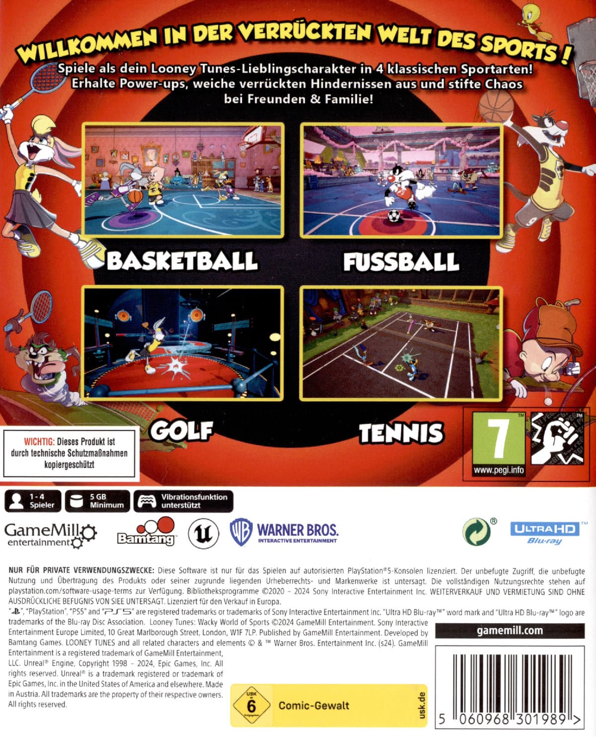 Die Looney Tunes sind wieder in Aktion, wenn Looney Tunes: Wacky World of Sports erscheint. Im ersten Looney Tunes-Videospiel für alle Heimkonsolen seit über einem Jahrzehnt kannst du dich mit deinen Looney Tunes-Lieblingen im Einzelspiel oder im lokalen Mehrspielermodus in vier rasante Sportarten stürzen. Tritt mit der Looney Tunes-Truppe in Basketball, Fußball, Golf und Tennis gegen Freunde und Familie an. Spiele Sie allein oder im lokalen Koop-Modus mit vier Spielern und wähle die Charaktere, die am besten zu deinem Spielstil passen. Weiche verrückten Hindernissen aus und erhalte Power-Ups, um Chaos zu stiften, während du deine Lieblings-Looney Tunes-Allstars steuerst!