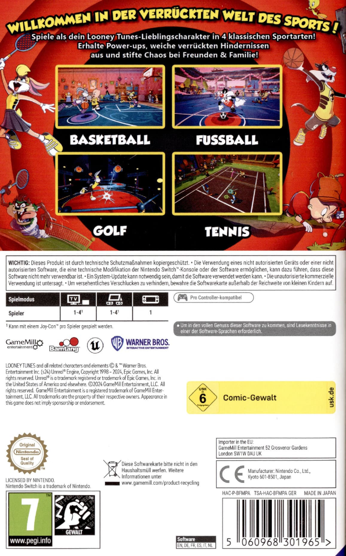 Das ist noch nicht alles, Leute! Die Looney Tunes sind wieder in Aktion, wenn Looney Tunes: Wacky World of Sports erscheint. Im ersten Looney Tunes-Videospiel für alle Heimkonsolen seit über einem Jahrzehnt kannst du dich mit deinen Looney Tunes-Lieblingen im Einzelspiel oder im lokalen Mehrspielermodus in vier rasante Sportarten stürzen. Tritt mit der Looney Tunes-Truppe in Basketball, Fußball, Golf und Tennis gegen Freunde und Familie an. Spiele Sie allein oder im lokalen Koop-Modus mit vier Spielern und wähle die Charaktere, die am besten zu deinem Spielstil passen. Weiche verrückten Hindernissen aus und erhalte Power-Ups, um Chaos zu stiften, während du deine Lieblings-Looney Tunes-Allstars steuerst! FEATURES • Vier actiongeladene Sportarten: Tritt gegen alle Rivalen in 2v2 Arcade-Basketball, 1v1 oder 2v2 Arcade-Tennis, 4-Spieler-Golf und 3v3 Arcade-Fußball an! • Tritt mit deinen Lieblingsspielern an: Wähle aus neun kultigen spielbaren Charakteren, die alle ihre eigenen Spezialitäten haben, darunter Bugs Bunny, Lola Bunny, Daffy Duck, Porky Pig, Elmer Fudd, Sylvester, Taz, Wile E. Coyote und der Road Runner • Tritt mit Freunden an: Genieße Arcade-Sport-Action allein oder mit bis zu vier Spielern im lokalen Koop-Modus. • Bereise das Toon-Universum: Spiele in kultigen Welten wie Galactic Outpost Delta, Porky's Barn, Foghorn's Farm, Road Runner's Canyon, Whispering Woods, Martian Command Center, Granny's House und vielen mehr! • Entfessle das gesamte Acme-Arsenal: Störe deine Gegner auf die verrückteste Weise, aber pass auf den Amboss auf! Spielsprache: English Bildschirmtext: German, Spanish, French, English, Italian