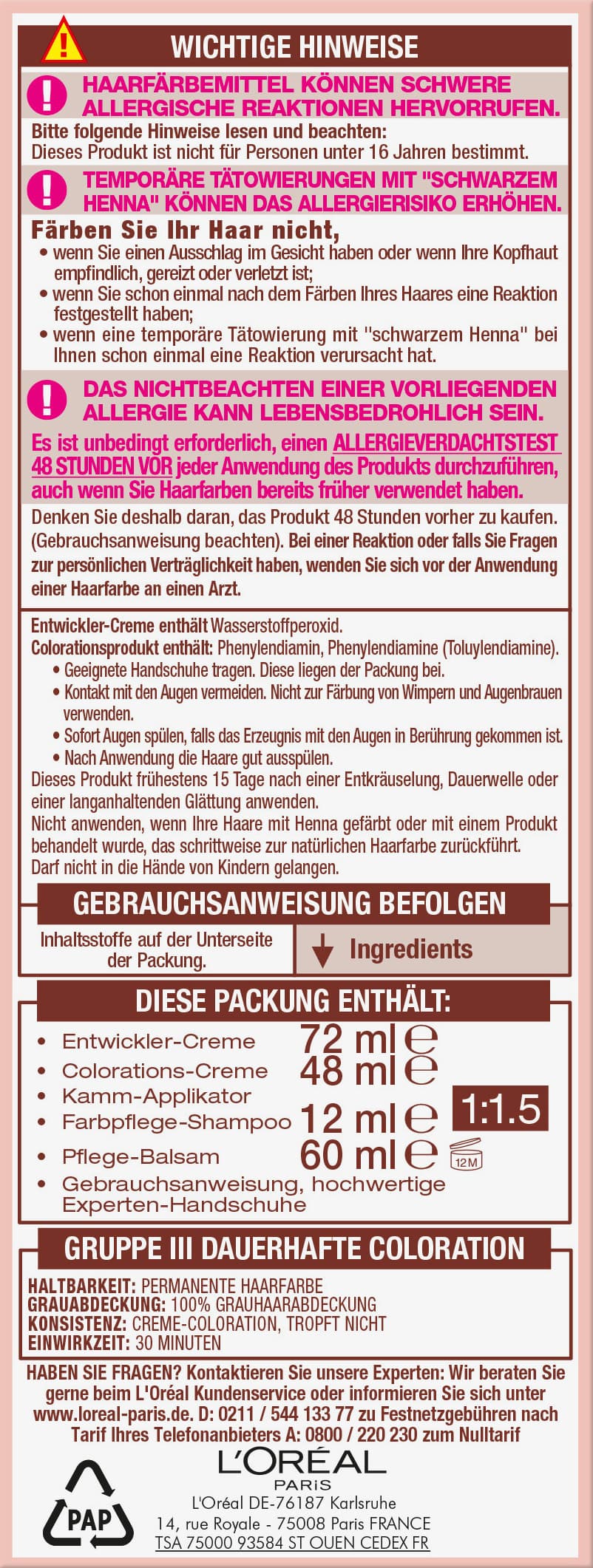 HAARFÄRBEMITTEL KÖNNEN SCHWERE ALLERGISCHE REAKTIONEN HERVORRUFEN.