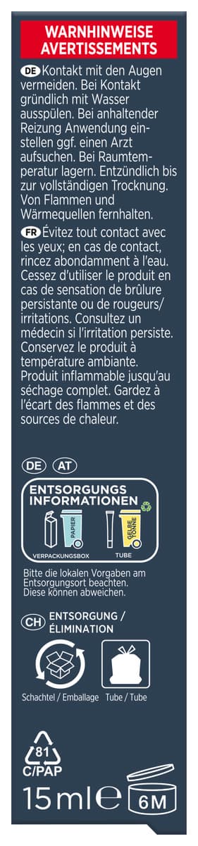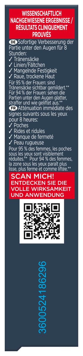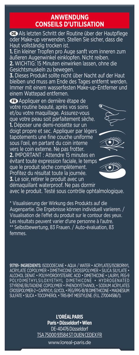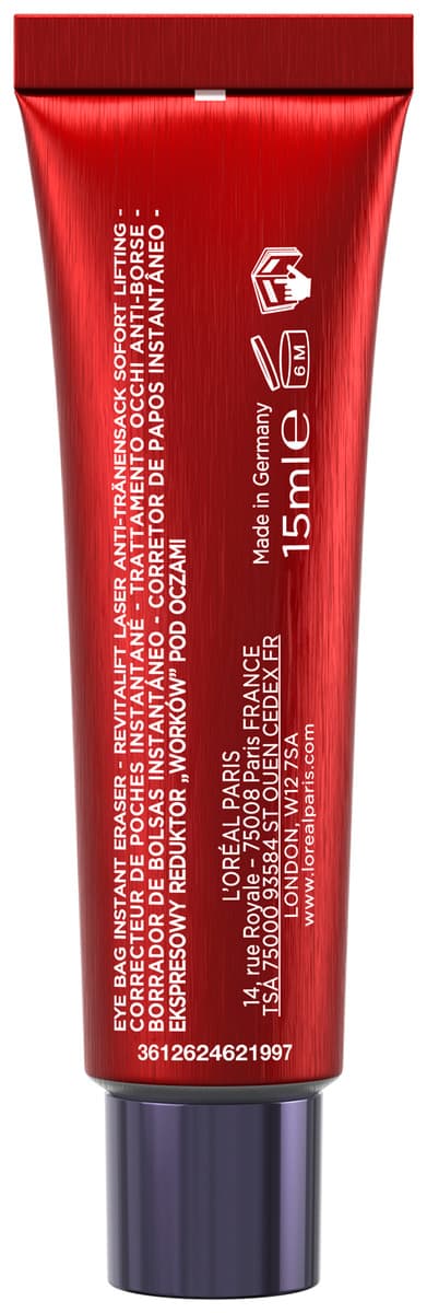 | Anwendungshinweis | Den L’Oréal Paris Revitalift Laser Eye Bags Instant Eraser als letzten Schritt der täglichen Pflegeroutine über der Hautpflege oder dem Make-up auftragen. Dafür eine fingerspitzengroße Menge pro Augenpartie auf der Augenpartie verteilen. Nun die Augenpflege mit sanftem Klopfen und minimalem Druck einmassieren. Anschließend mithilfe der Fingerspitzen das Produkt sanft nach außen verteilen. Dabei nicht reiben. Im Anschluss 15 Minuten lang einwirken lassen. In dieser Zeit das Gesicht entspannen und jegliche Mimik vermeiden, bis das Produkt eingezogen ist. |