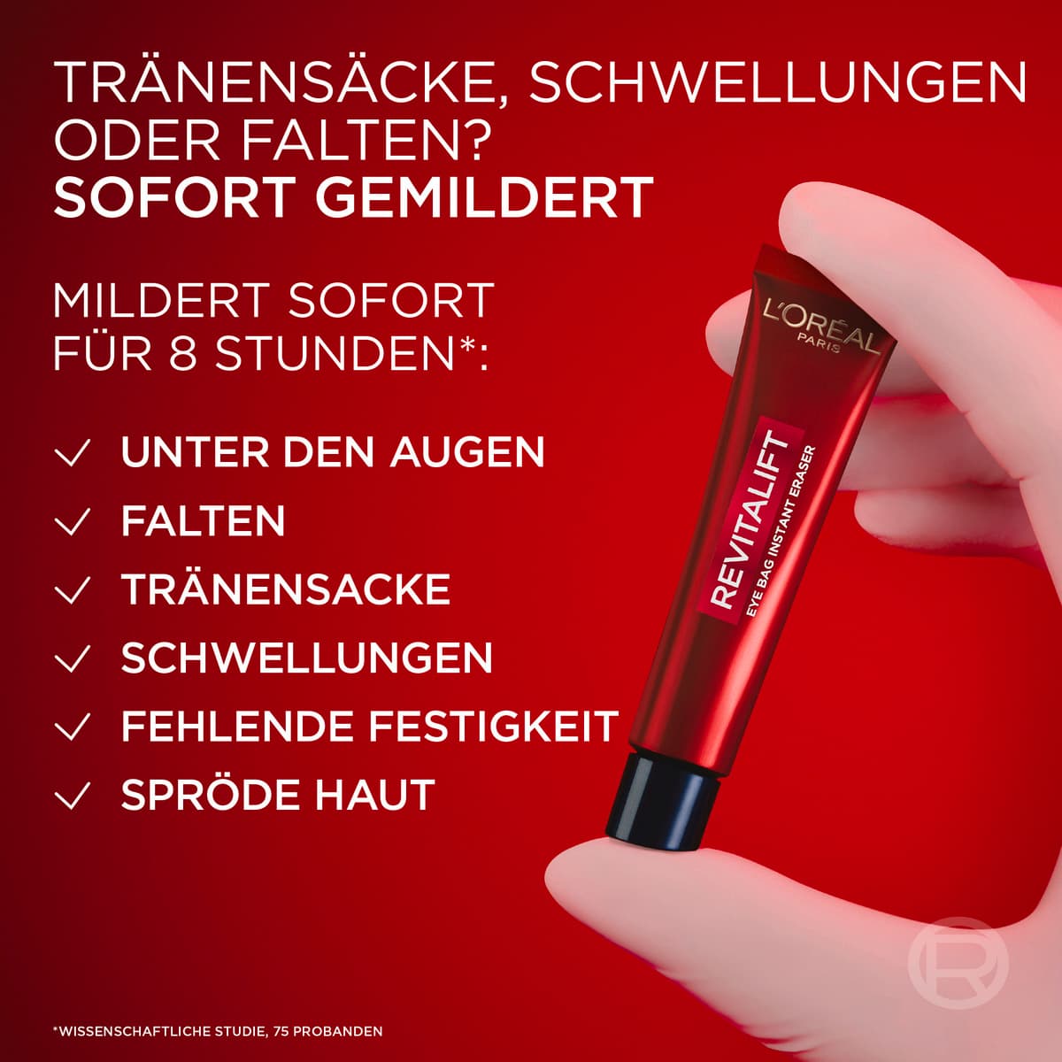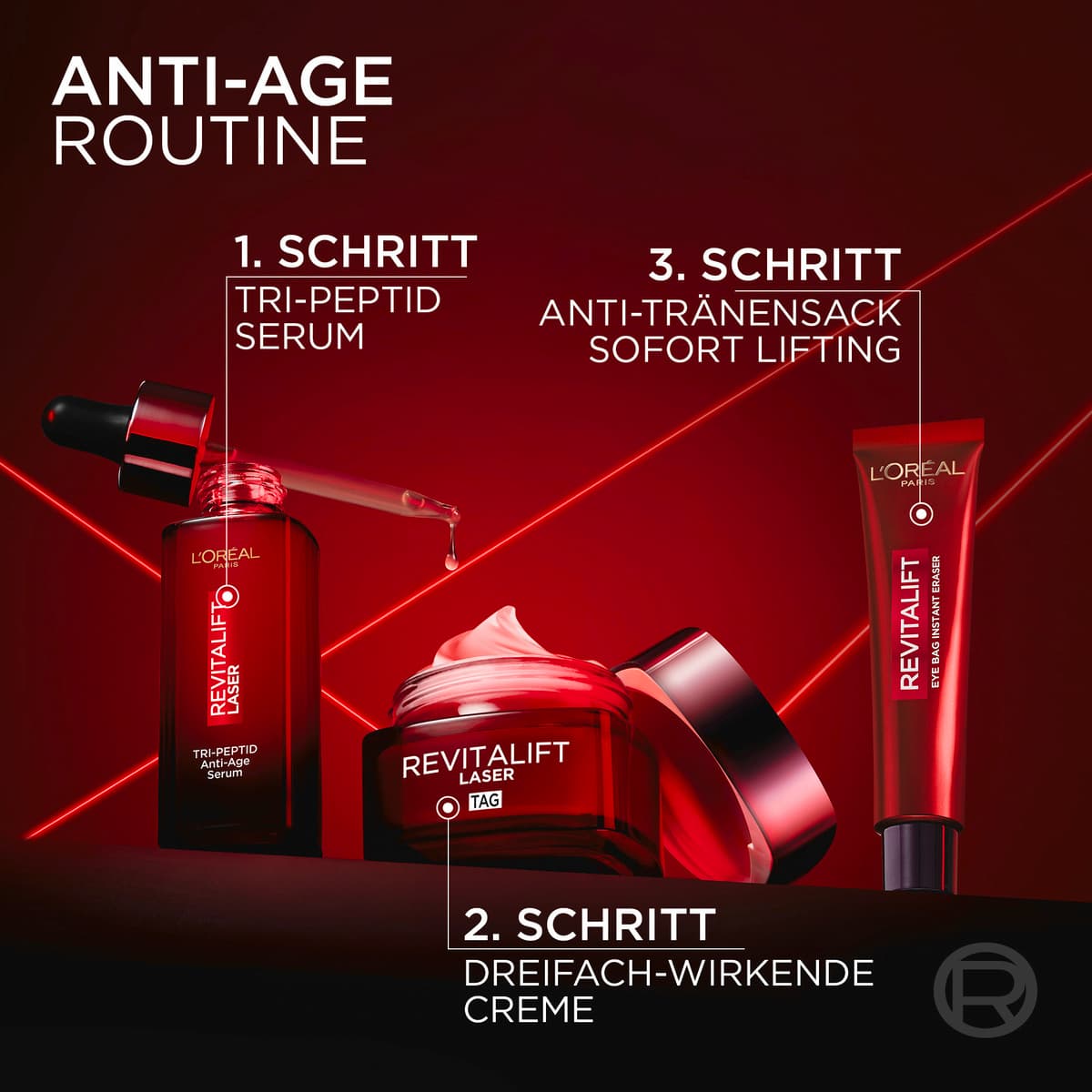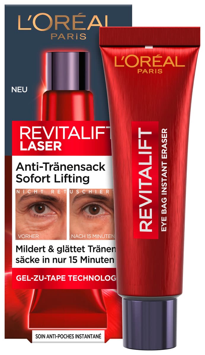 - Die L’Oréal Paris Revitalift Laser Anti-Tränensack Sofort Lifting Pflege für die empfindliche Haut rund um die Augen